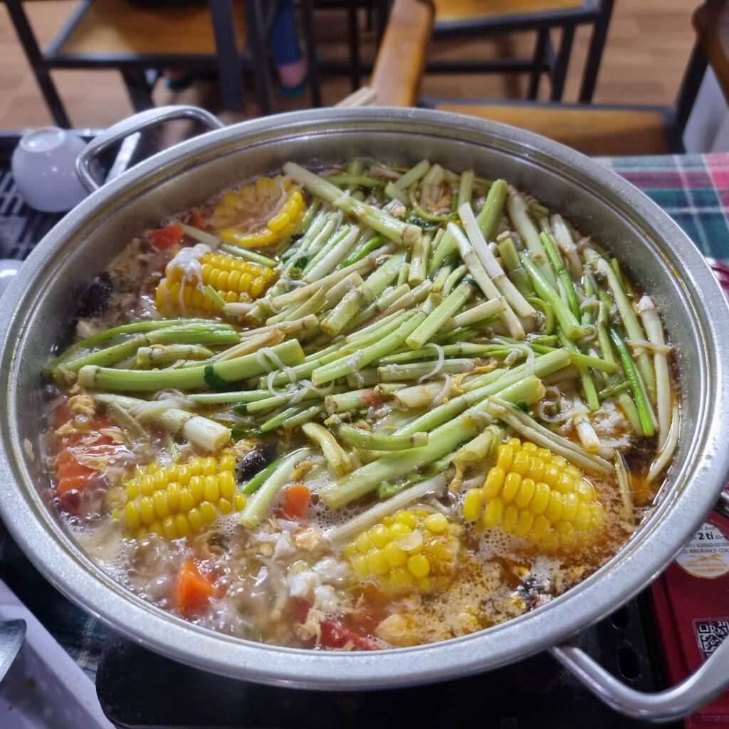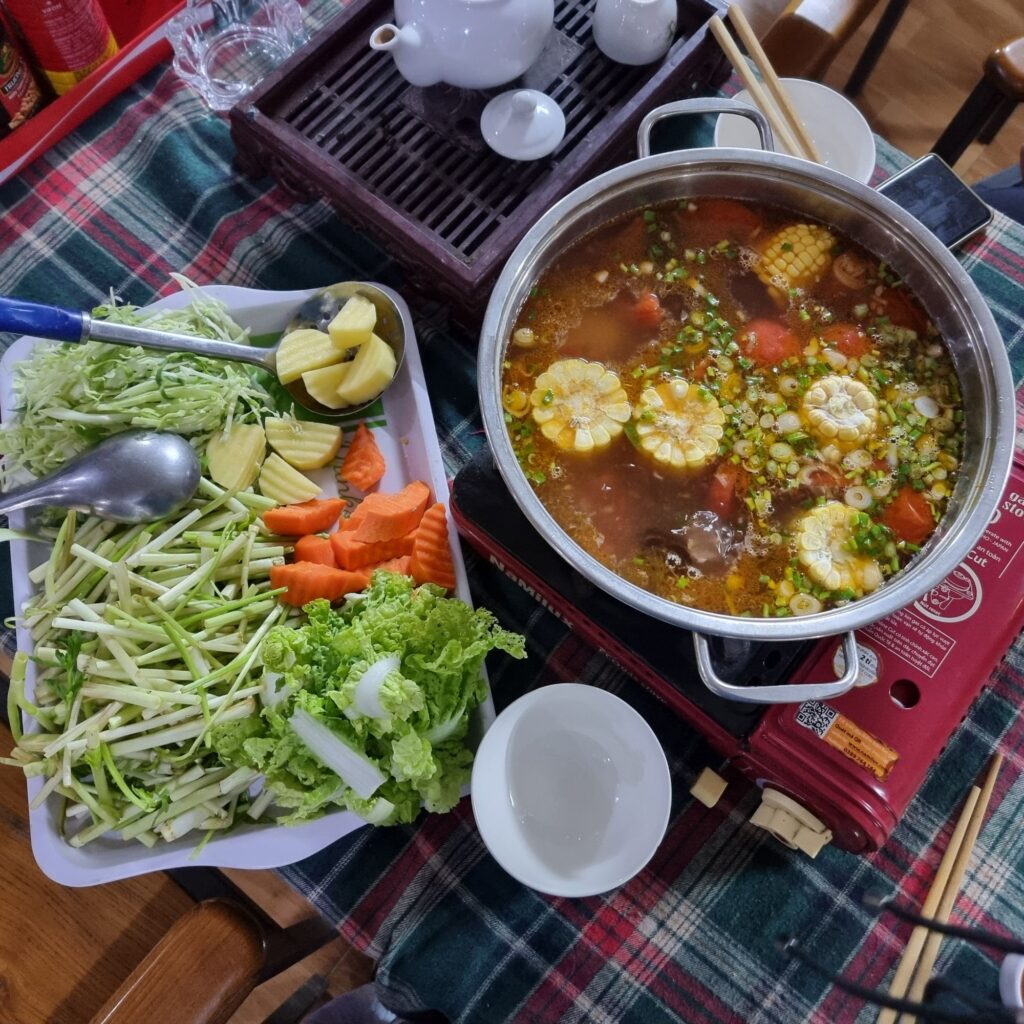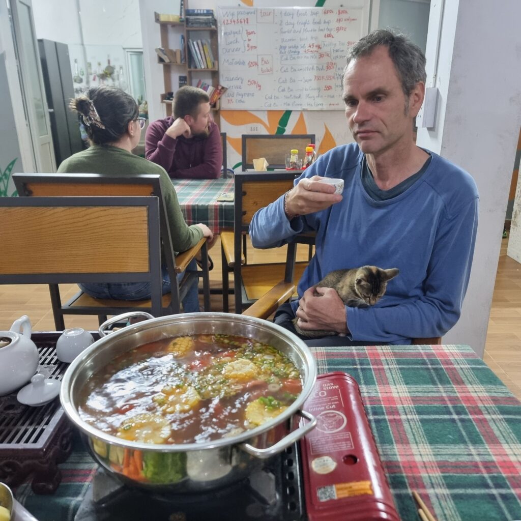 Zurück gehts erst, als es dunkel wird und das Moped bringt uns zurück zum Countryside Homestay, wo es heute “Hot Pot” gibt, zum Essen, nicht zum Baden! Erinnert ein bisschen an die japanische Sumoringersuppe Chankonabe, man gibt die Zutaten selbst in die Suppe, die auf einem Gaskocher in der Mitte köchelt.