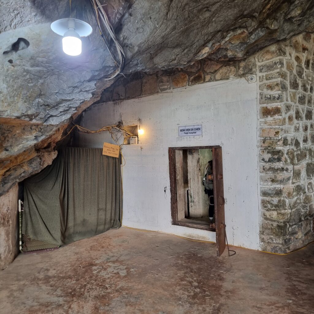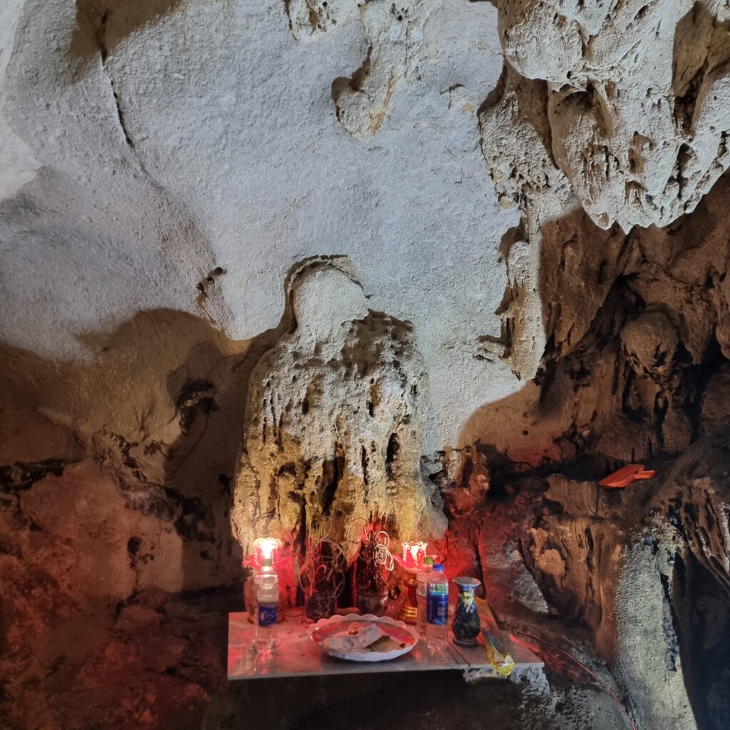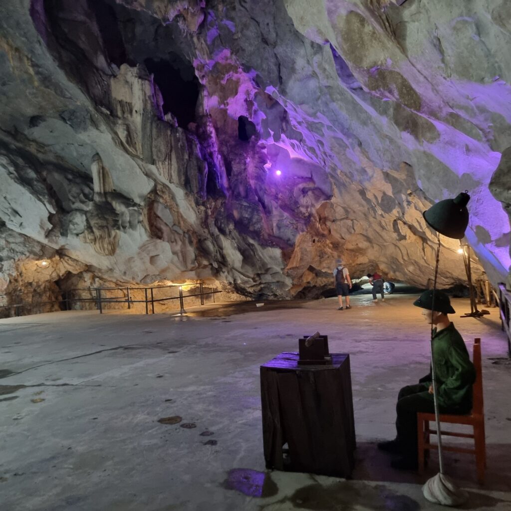 Zwei Karsthöhlen, die durch Wasser geformt sind, liegen gleich neben unserer Unterkunft, eine davon wurde im Krieg seit 1963 als Lazarett betrieben – Onkel Ho Chi Minh war auch hier zur Eröffnung. Ganz ungewohnt, in eine Höhle zu gehen und es ist warm drin!