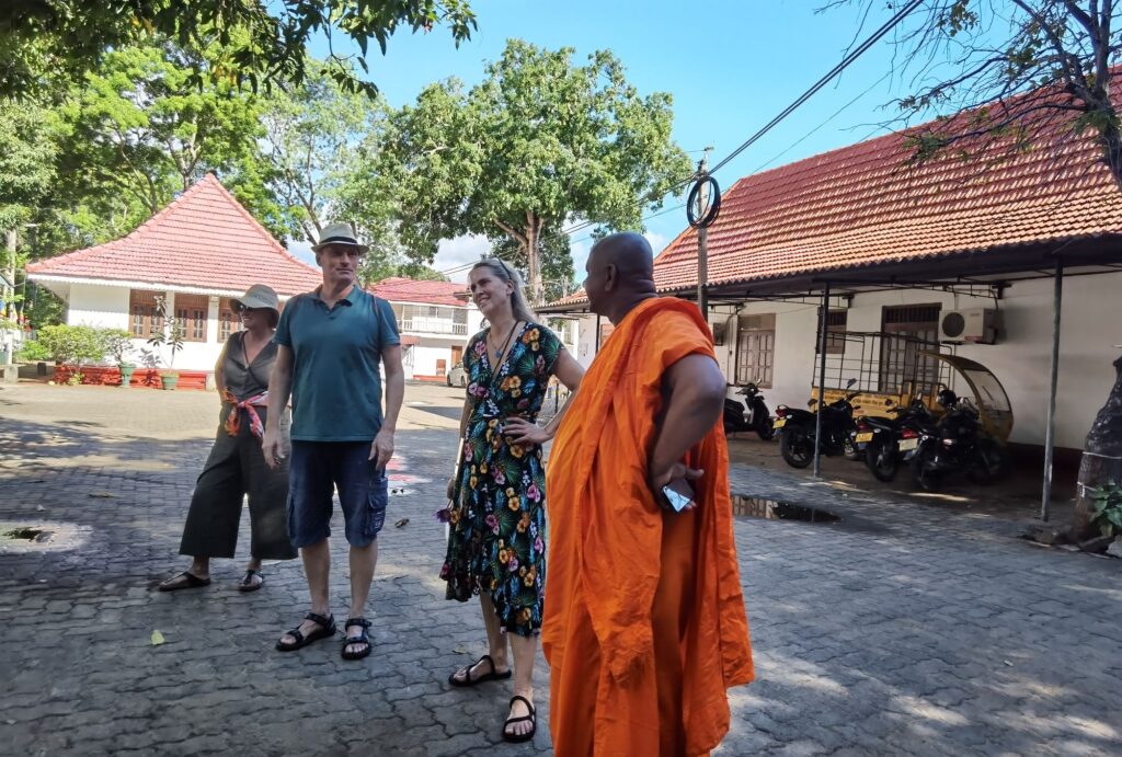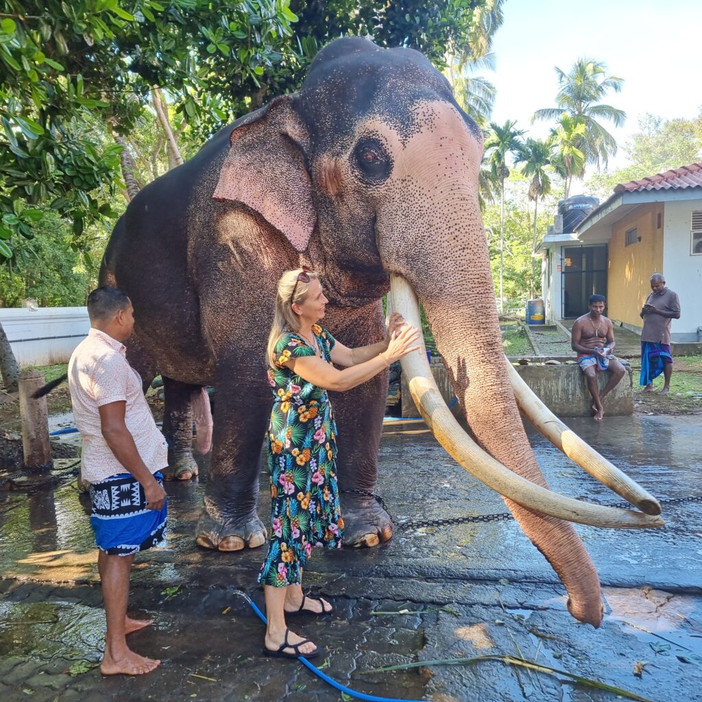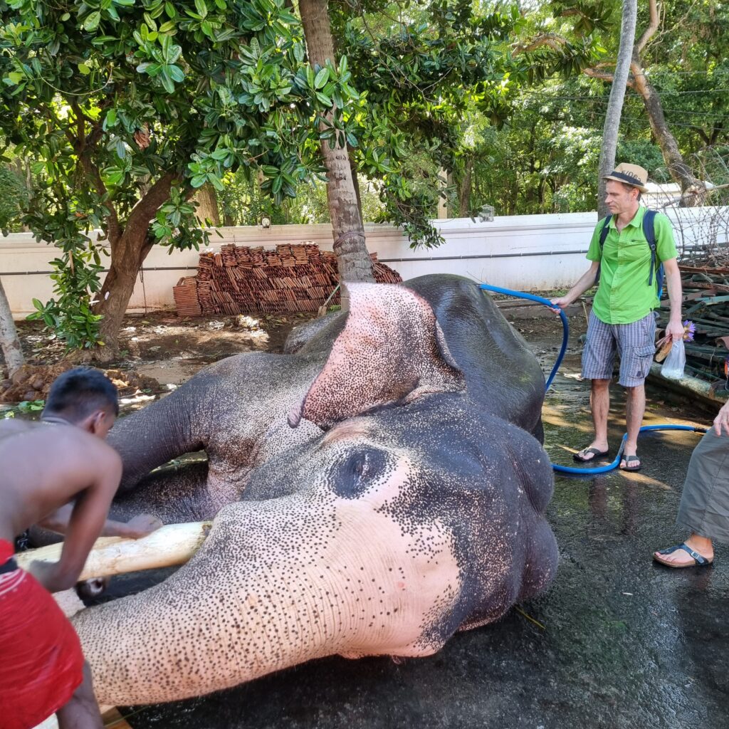 Dann sind wir im wunderschönen Tempel von Kataragama (wir waren die einzigen Ausländer!) mit einem Mönch ins Gespräch über Elefanten gekommen. Daraufhin brachte er uns zur Waschung und wir durften auch das zahme Tier reinigen- mit Kokosnussschalen!