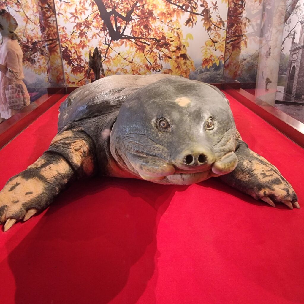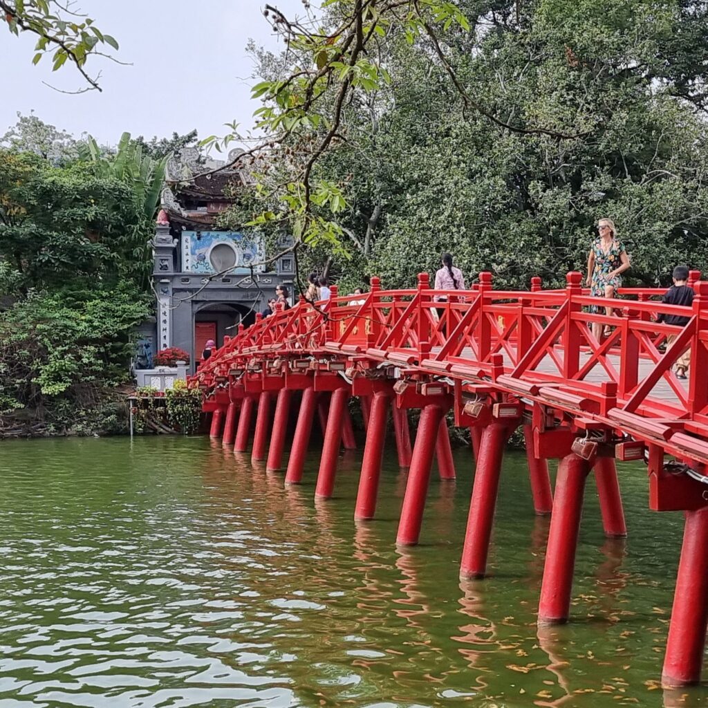 Eine chice rote Brücke führt zum Tempel im See, wo riesige Lederschildkröten ausgestellt sind, ein Heiligtum des Landes