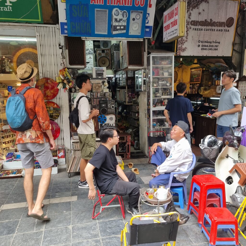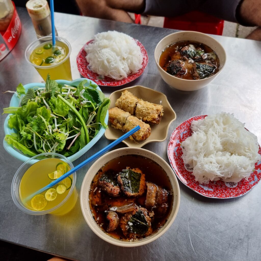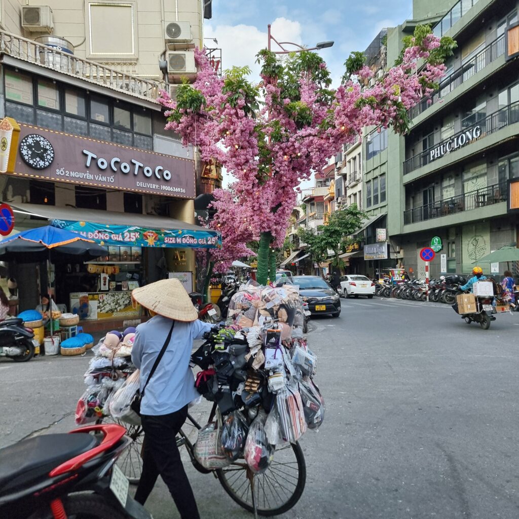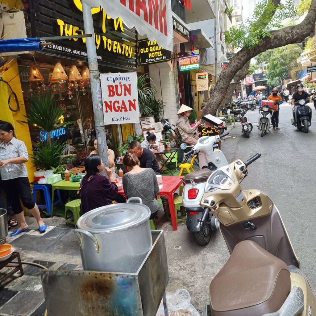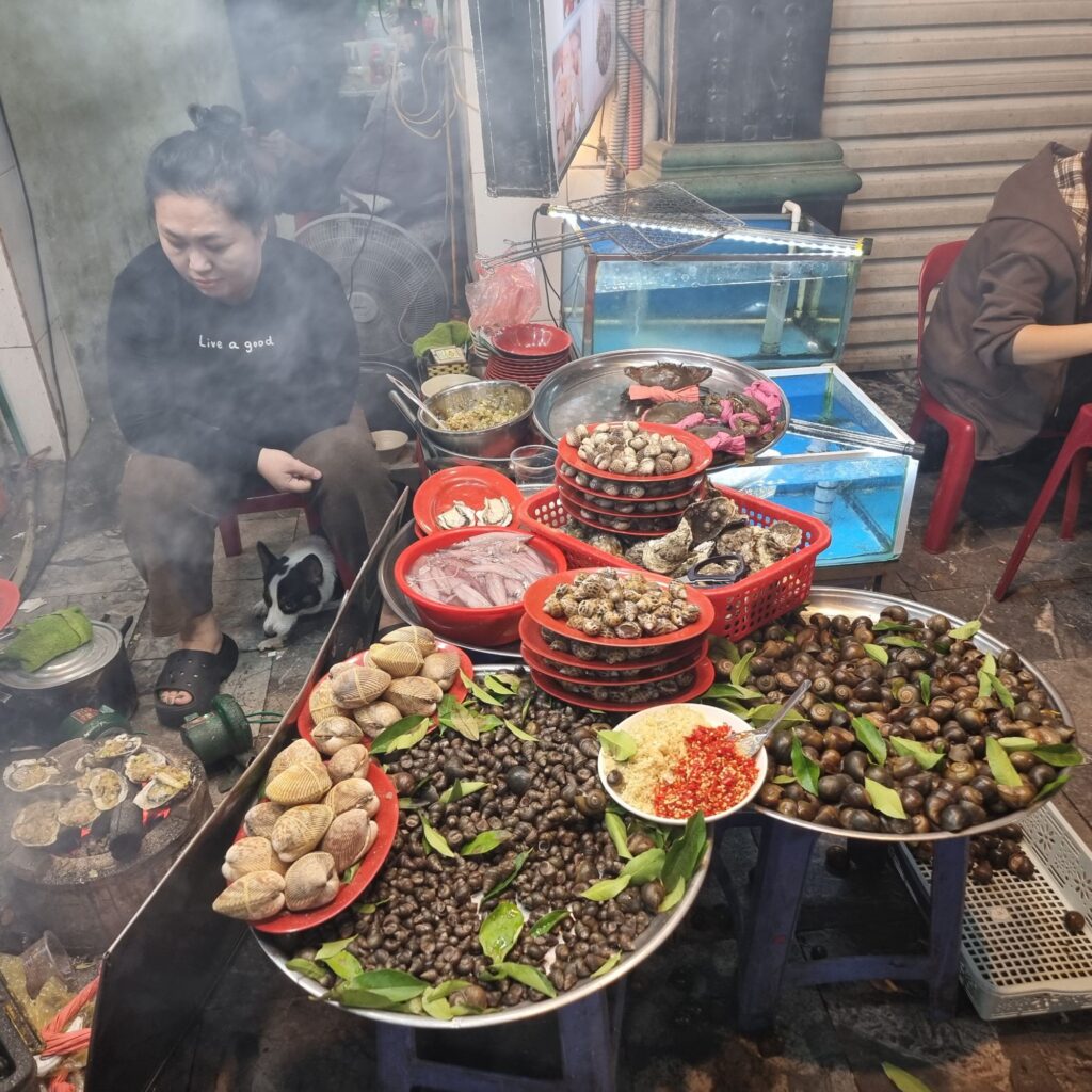 Gefühlt jeder 2. Laden bietet was zu Essen an und das wird von den Leuten genutzt! Alles findet auf der Strasse statt, bis zum Abwasch, man sitzt auf winzigen Plastehockern und schlürft z.B. eine leckere Pho, die aus Hanoi kommt