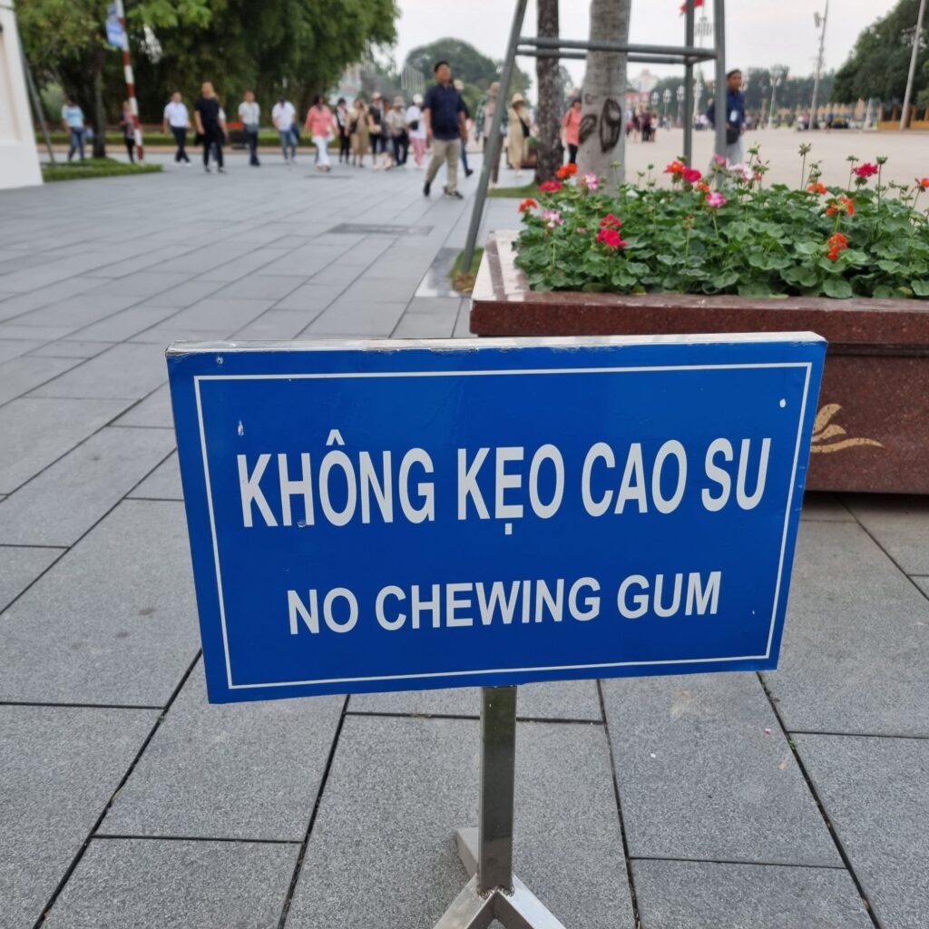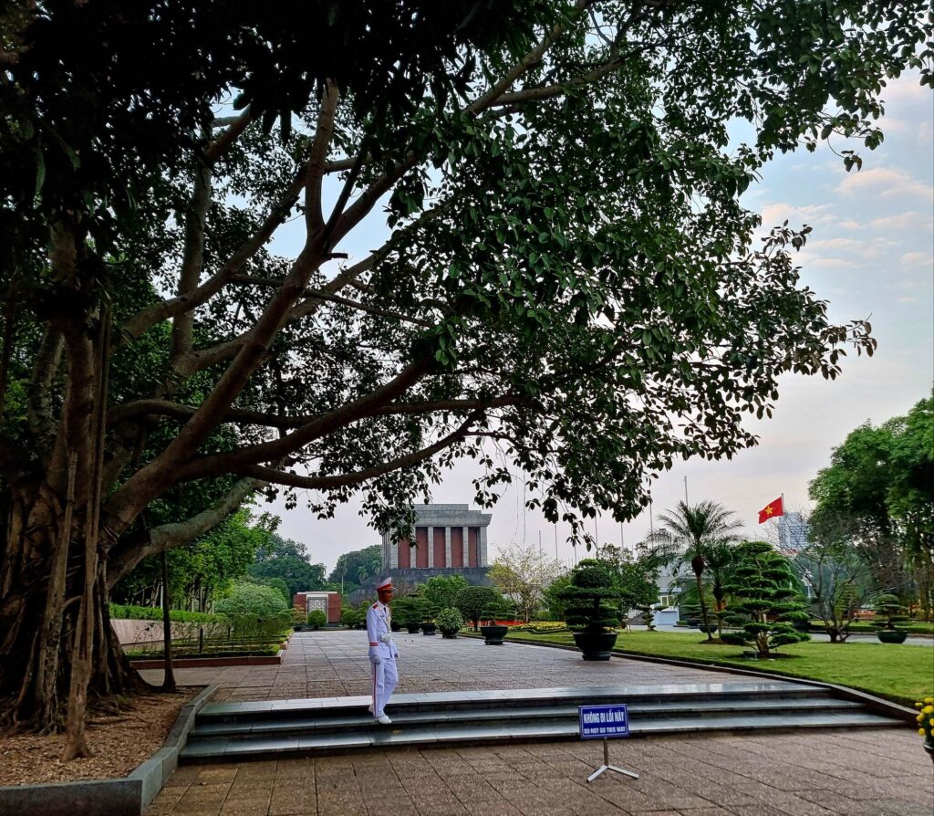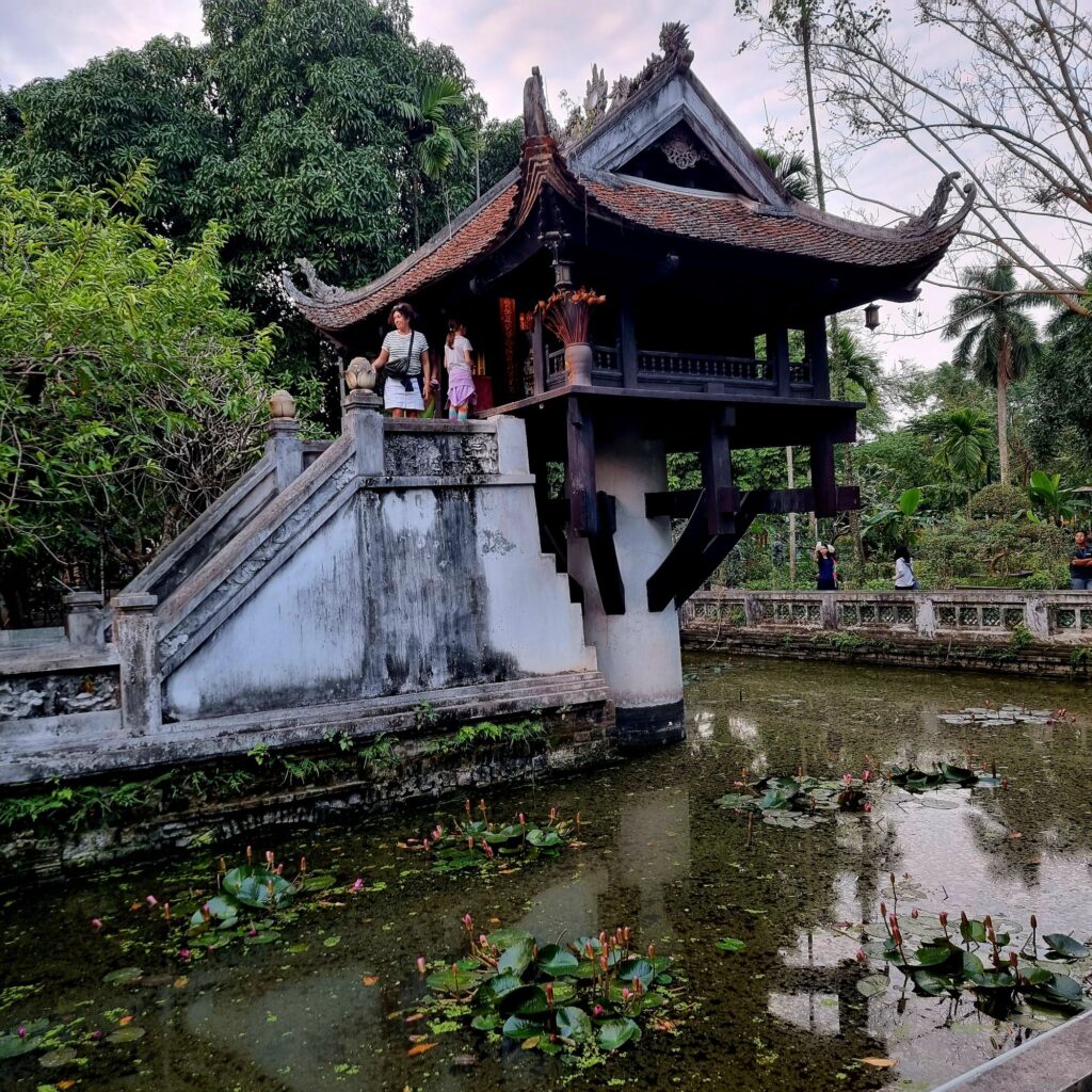 Ho Chi Minh, der gar kein Mausoleum wollte, hat hier trotzdem eins bekommen, da gehen wir nicht rein, stehen uns auch zu viele Uniformierte rum, daneben ist gleich eine schöne Einsäulenpagode