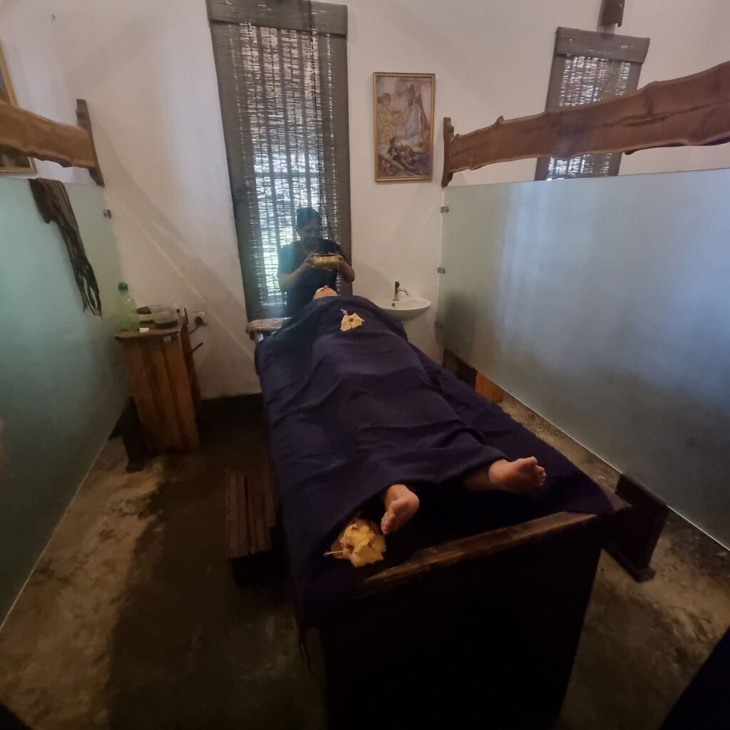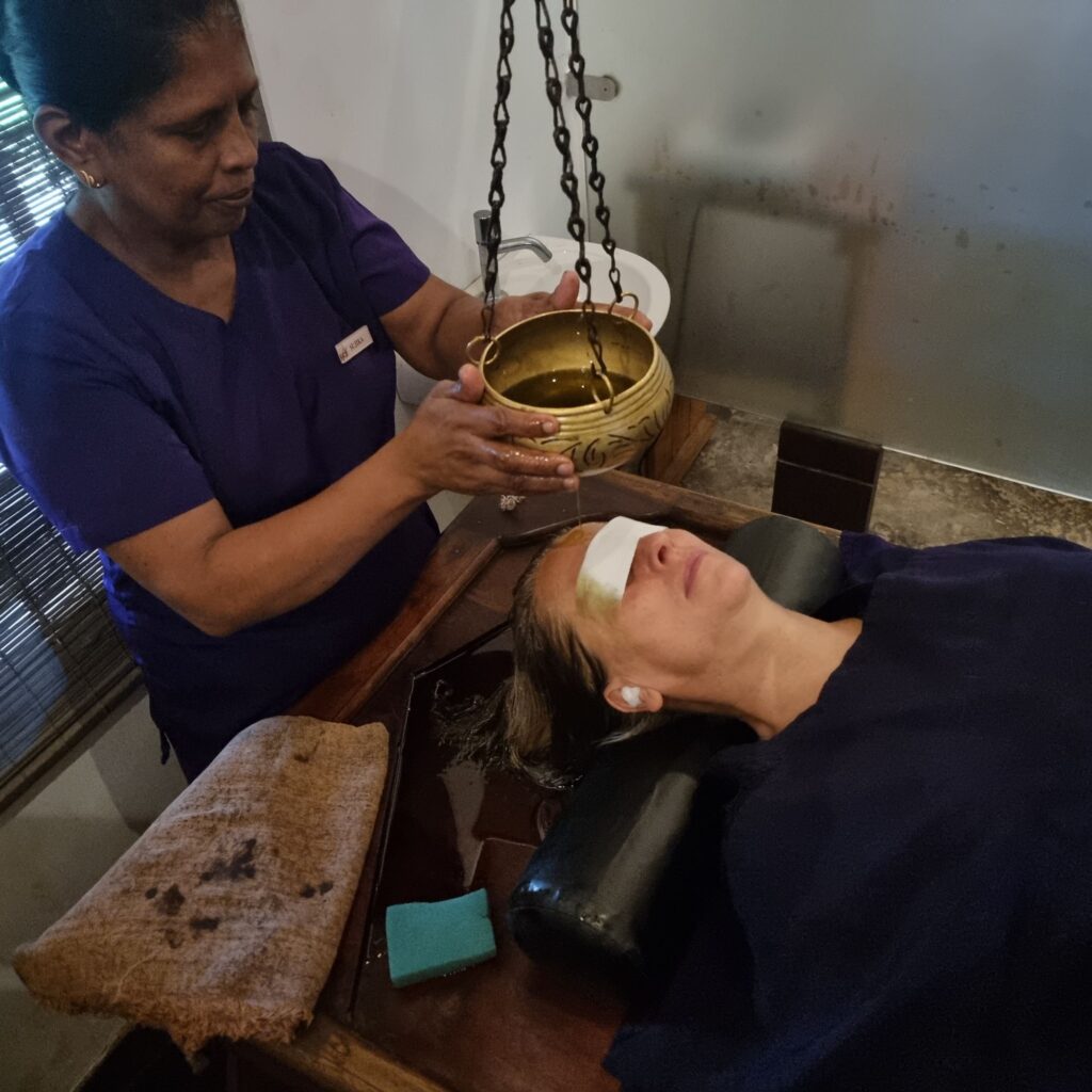 Eine der bekanntesten Behandlungen ist SIRODARA, wo 20 Minuten lang ein leichter Strahl warmes Kräuteröl von links nach rechts über die Stirn fließt.