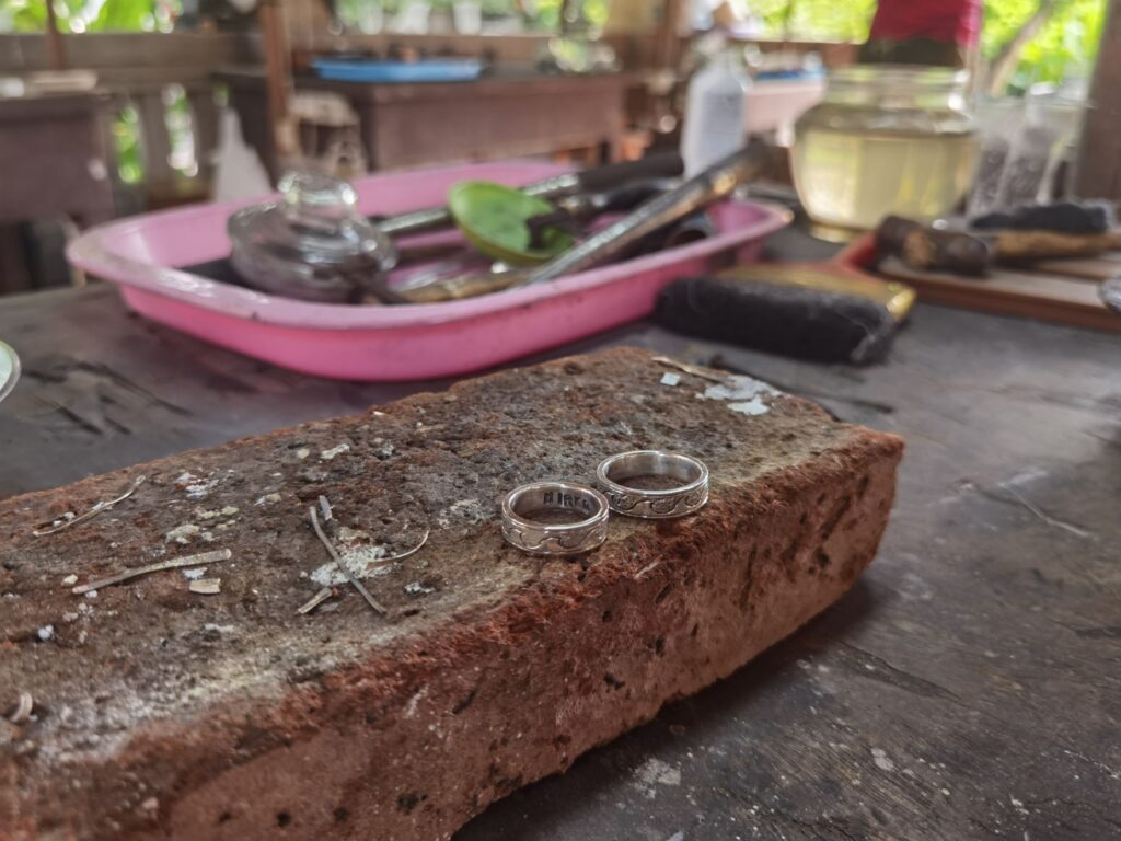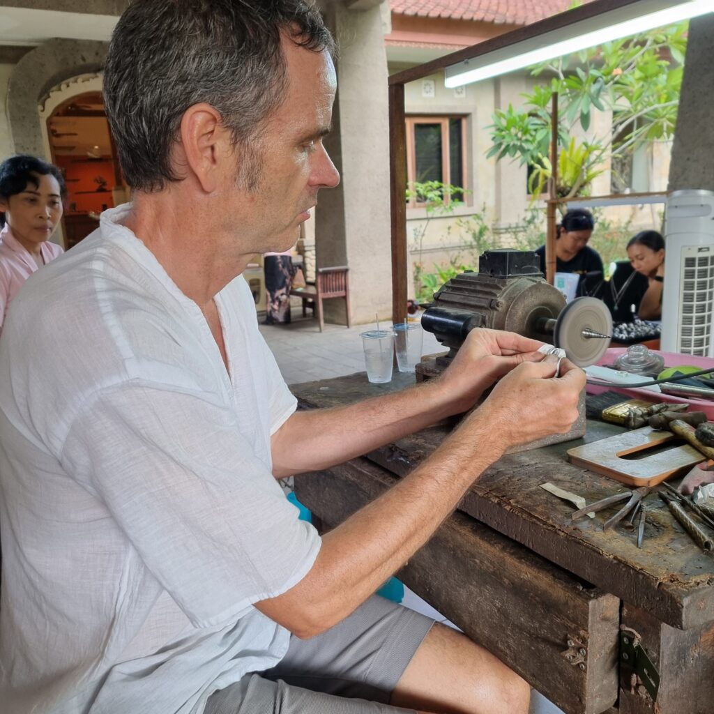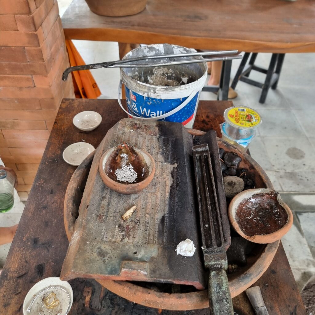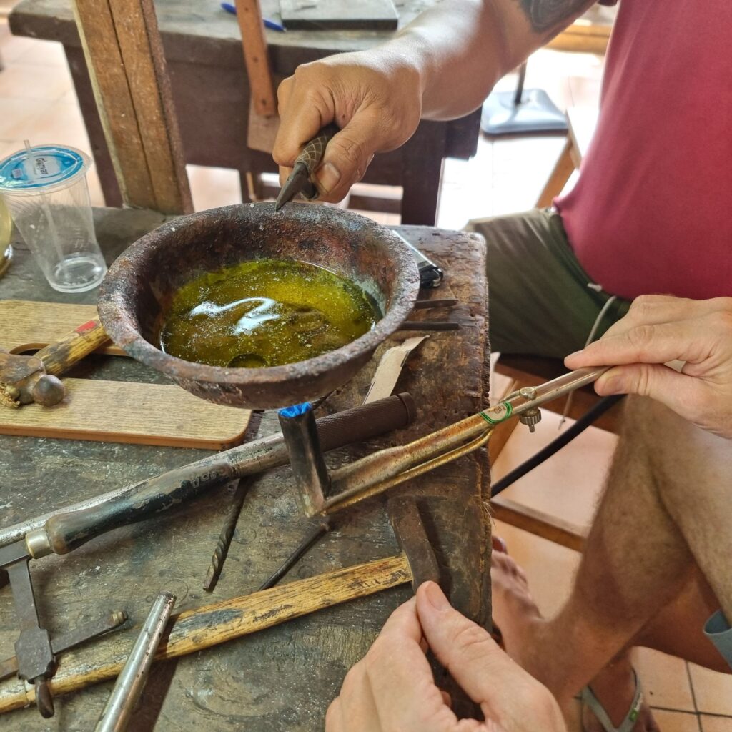 wir sind Wiederholungstäter, haben aber diesmal eine sehr viel schönere Werkstatt gefunden! Vom Einschmelzen des Rohsilbers aus Borneo bis zum polieren, alles dabei!