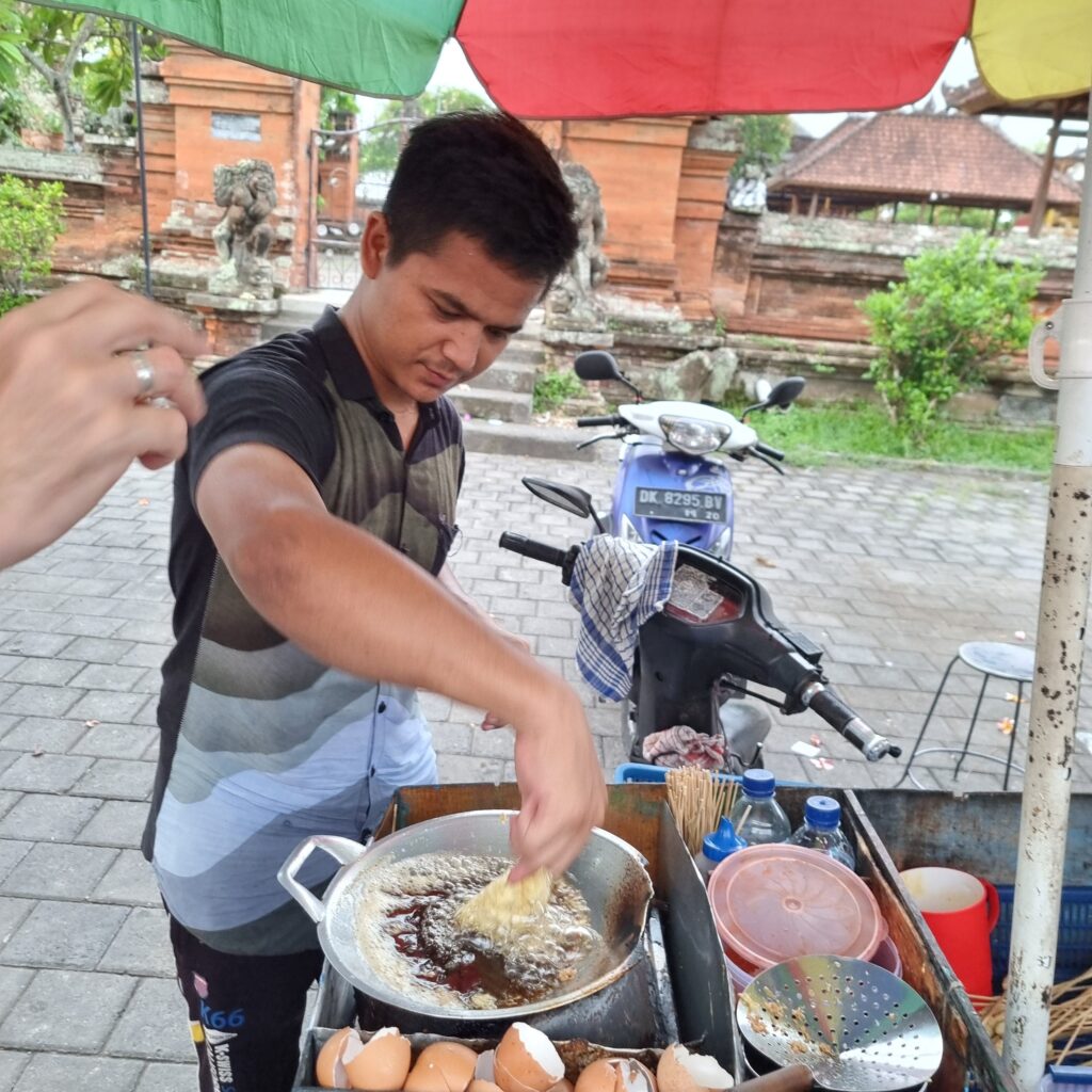 Händler warteten schon mit frisch bereiteten Leckereien zum kleinen Preis: hier z.B. Nudeln auf Stäbchen, durch siedenes Ei gezogen und in scharfe Tomatensoße getaucht- lecker!