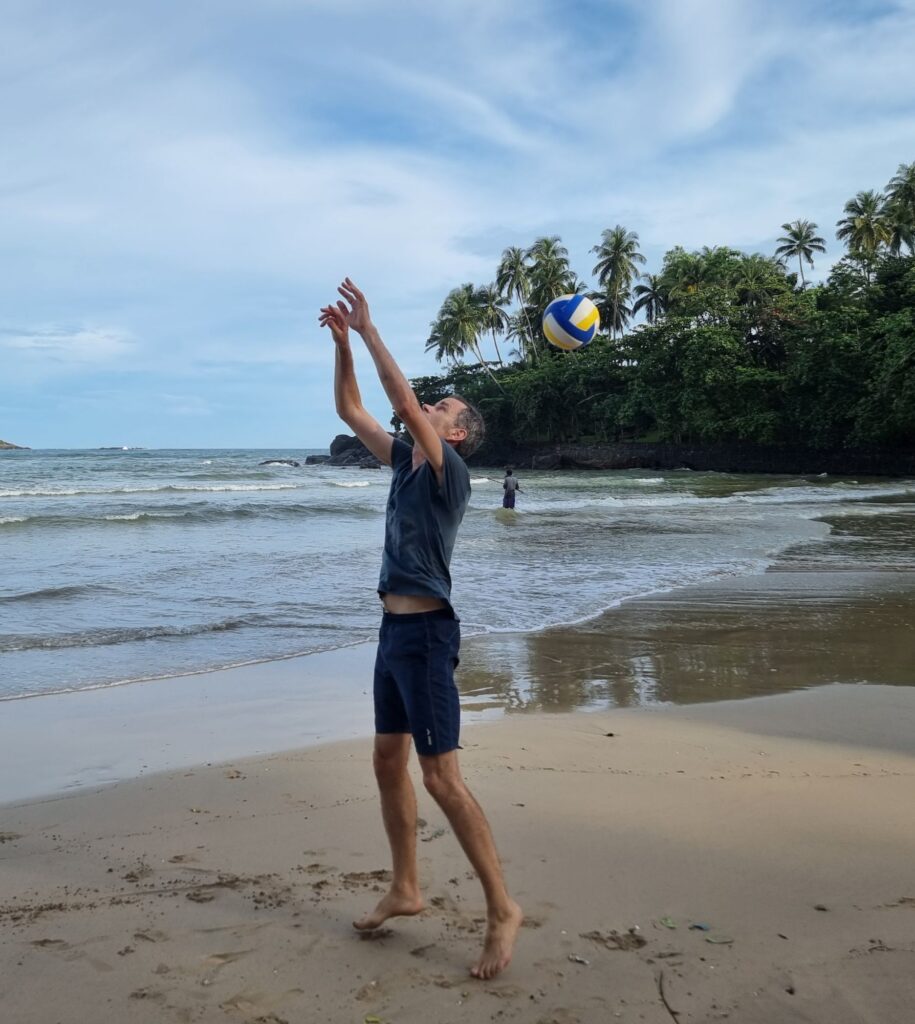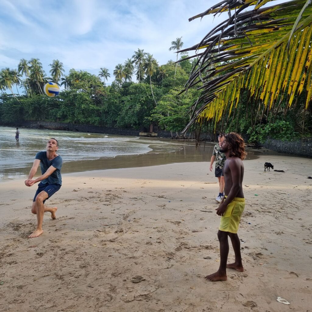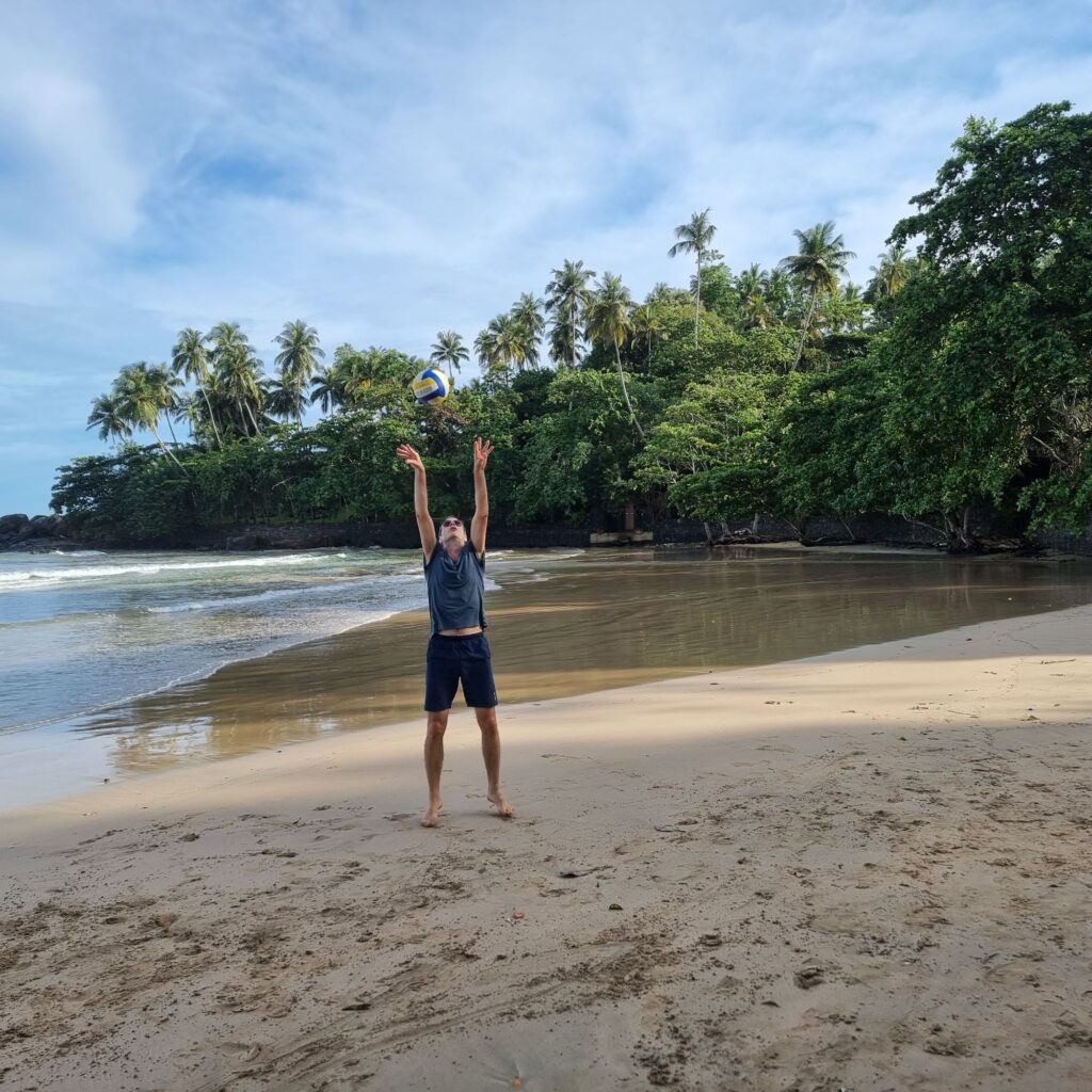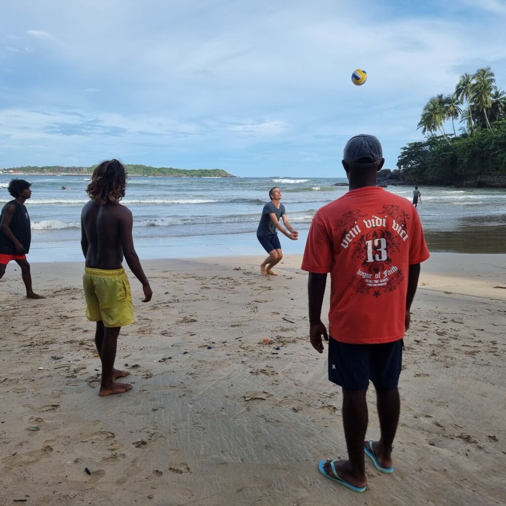 Gestern sollte es endlich zum Beachvolleyball Match mit der Jugend vom Strand kommen (die trafen wir kürzlich auf der Mole, wo sie Sri Lanka Rap aus nem aufgepimpten TukTuk hören). Leider hatte der Sturm das Netz mitgenommen und auch gleich die Hütte vom Surflehrer zerlegt. Bleibt nur ein kleiner Ballwechsel mit einem Ball, hart wie eine Kokosnuss