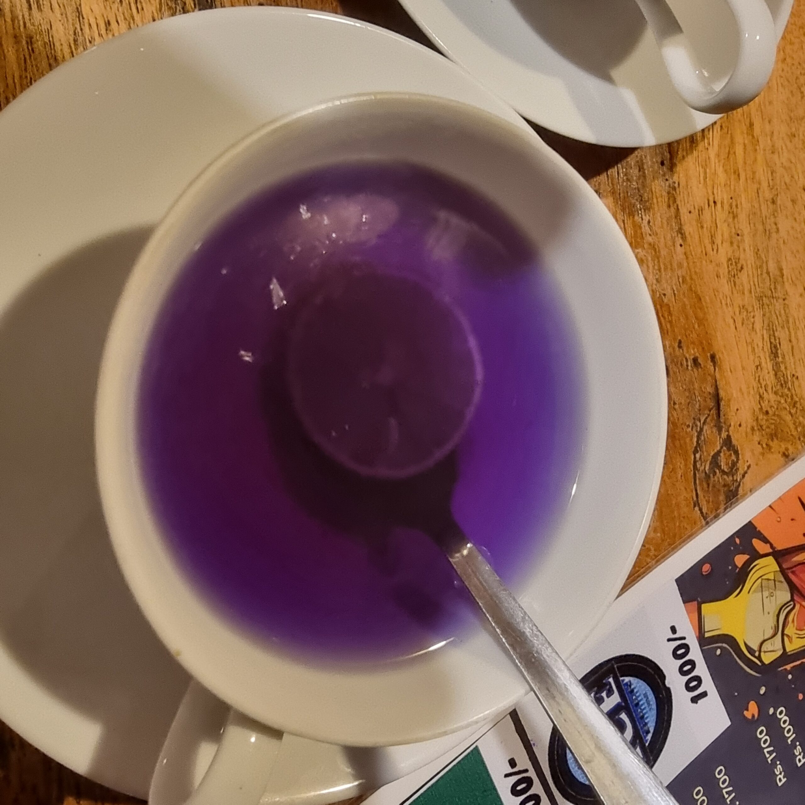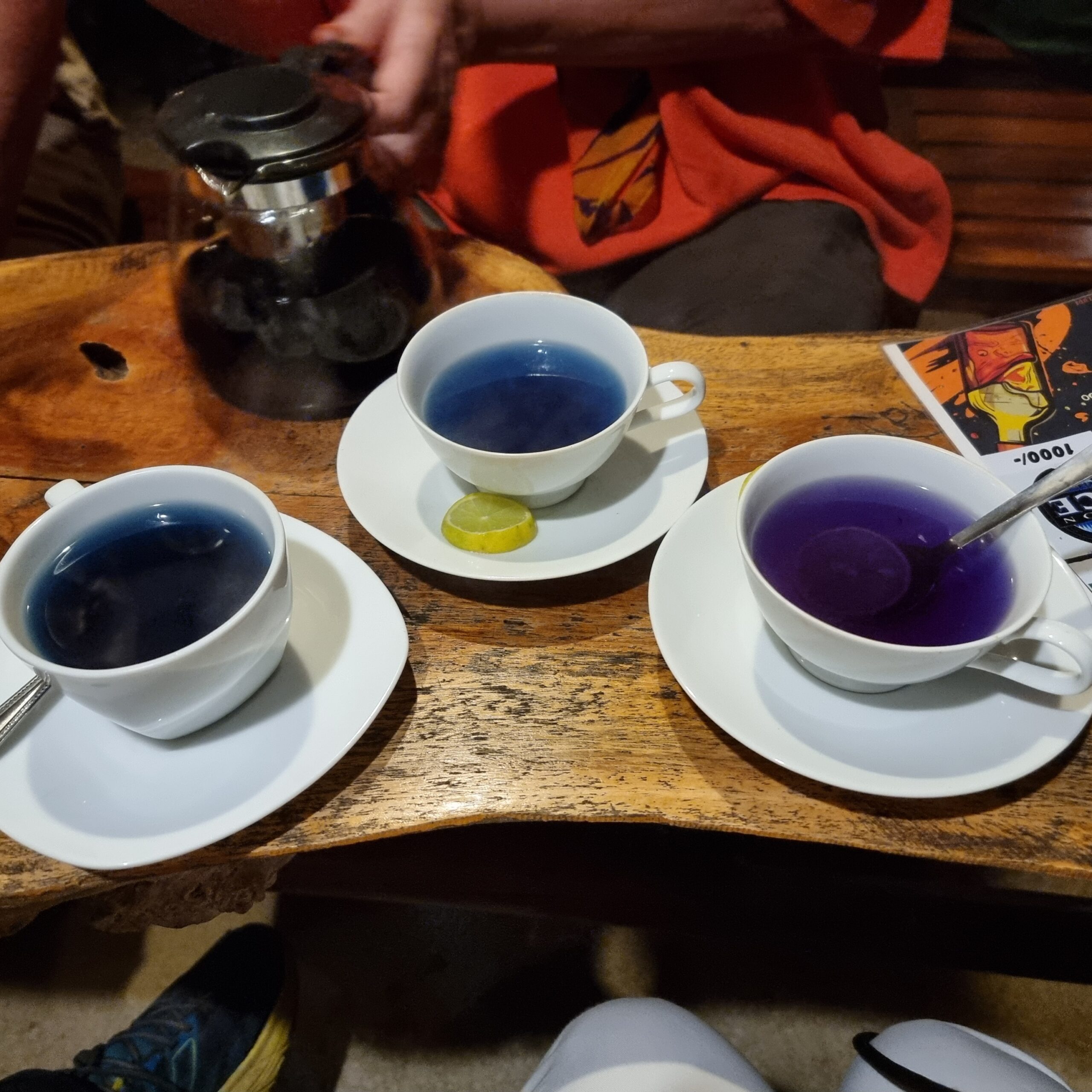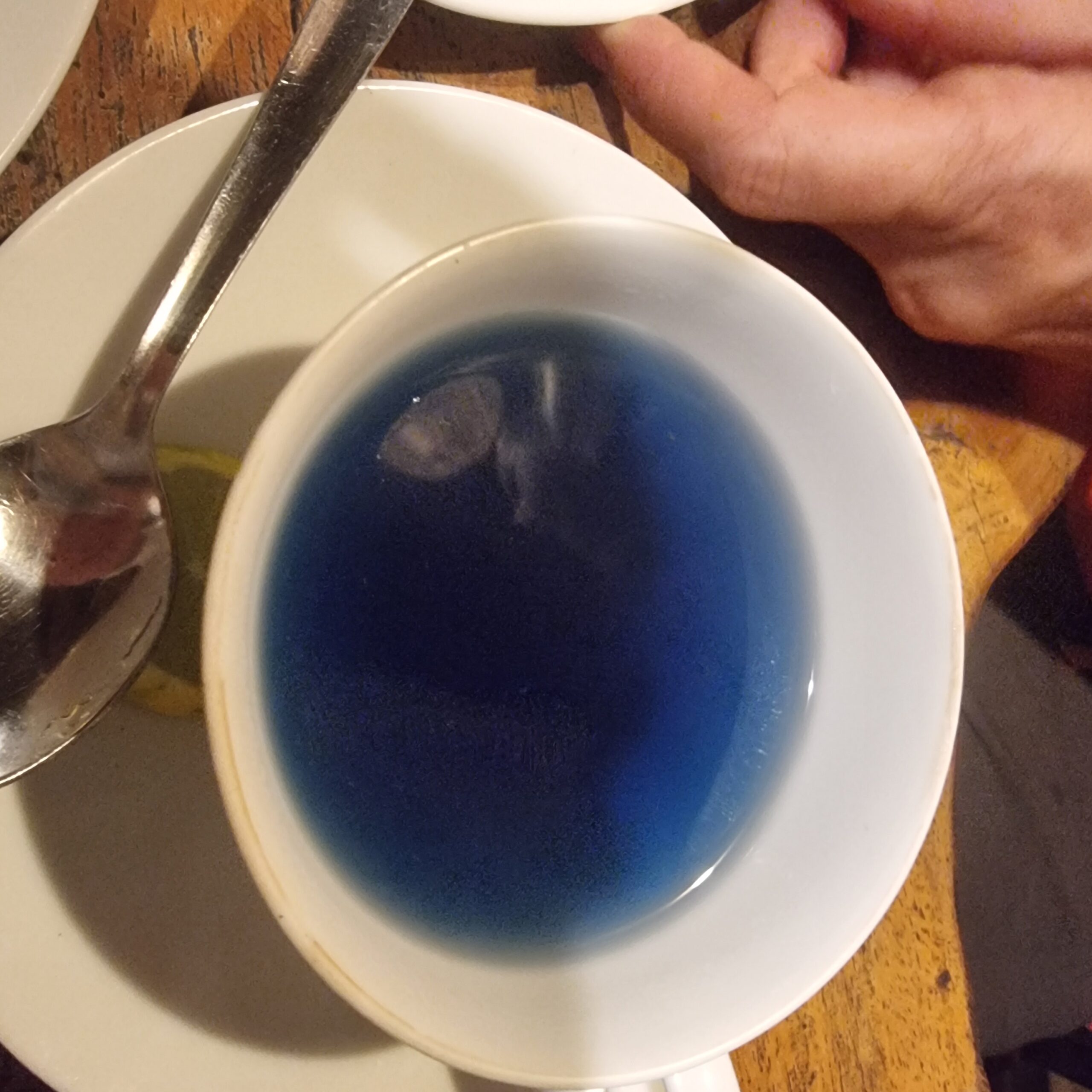 Blue Tea, der aus Blumen besteht, ist hier kein Tee, sondern „Infusion“. Kommt Zitrone hinzu, ändert sich die Farbe!