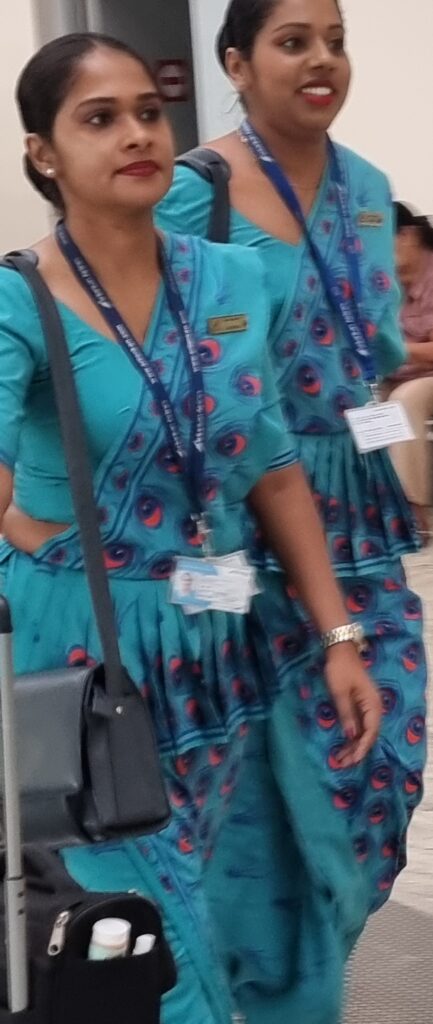 Schon die Stewardessen begrüssen uns so farbenfroh wie Land und Meer.