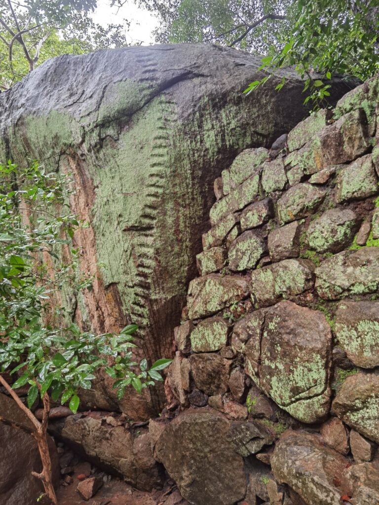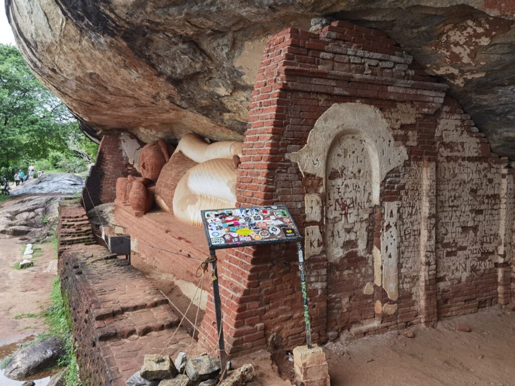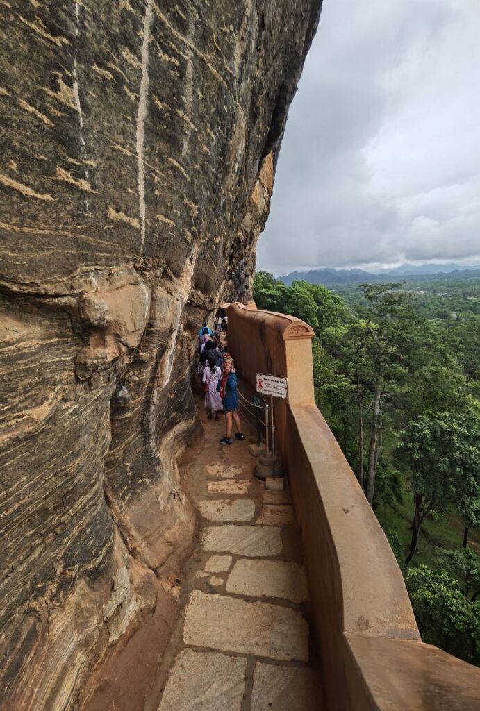 ..wohnen hier unter tiefhängenden Schleiern, in Sigiriya. Im 5ten Jahrhundert wurde nicht nur der Palast neu aufgebaut, sondern der Fels auch mit 80 Schönheiten bemalt. Ein paar davon haben es im Schutz einer Boofe in die Neuzeit geschafft. Inzwischen sind Graffiti nicht mehr das Hauptproblem sondern die Blitzlichter der Touris- drum darf man nicht mehr fotografieren..