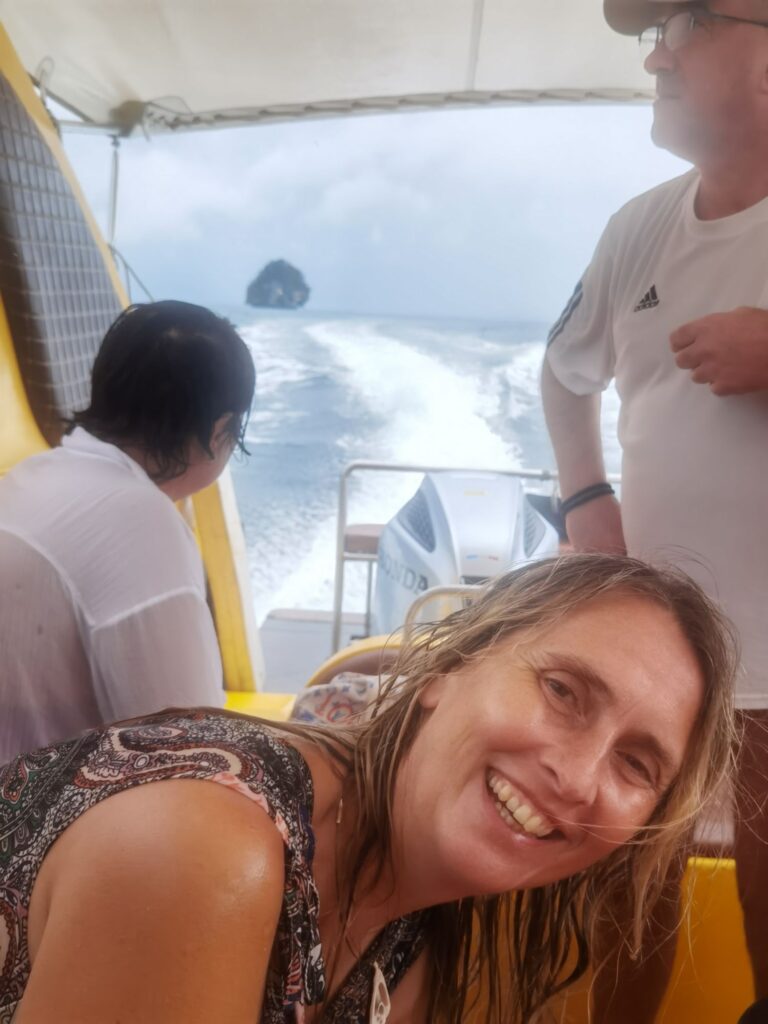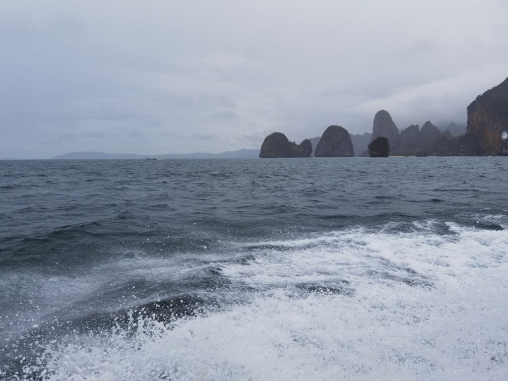 Wir schließen uns also einer Tour auf einem Schnellboot an und merken schnell, dass wir nur mit Badesachen hätten kommen sollen. Das Wetter geht von regnerisch zu sehr windig über und immer mehr Brecher kommen über das Boot. Den Kapitän stört das nicht und gibt weiter Vollgas.