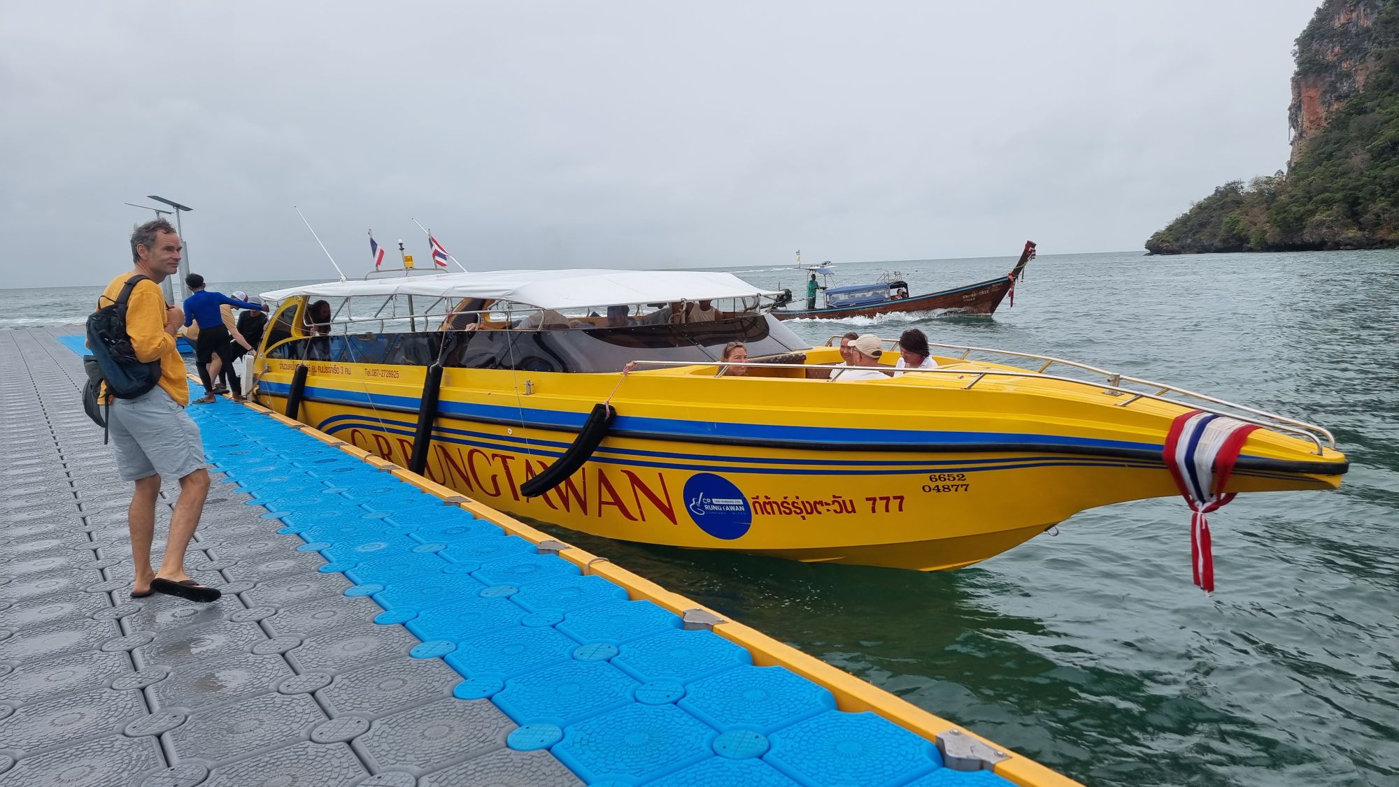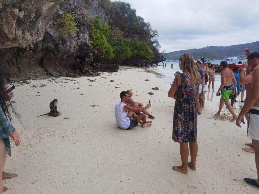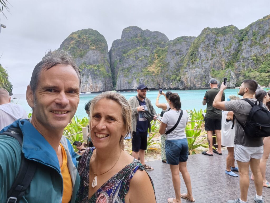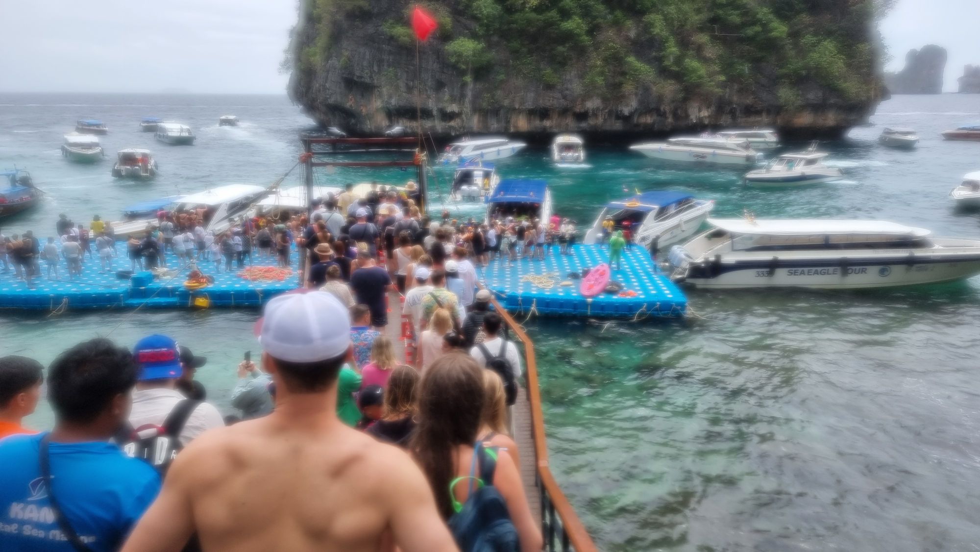 Wir werden eingesammelt, der Zeitslot auf Phi Phi wartet! “der Strand” wurde für die Dreharbeiten gerodet und aufgeschüttet. Touristen badeten zu Tausenden in der Bucht und die Boote warfen Anker im Riff. 80% davon sind inzwischen zerstört und die ganze Insel wurde mehrfach gesperrt. Jetzt gibt es einen umkämpften Anleger auf der Rückseite und ein Besuchermanagement System, das seines gleichen sucht! Die Massen werden auf markierten Stegen über die Insel geleitet und am Strand immer wieder aus dem Wasser gescheucht. Surreal!