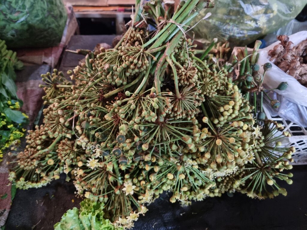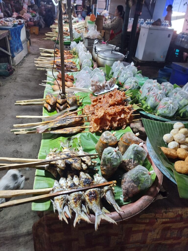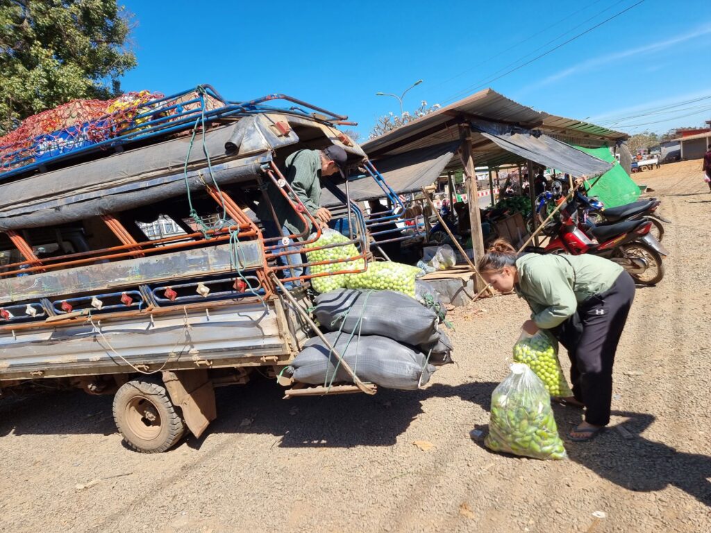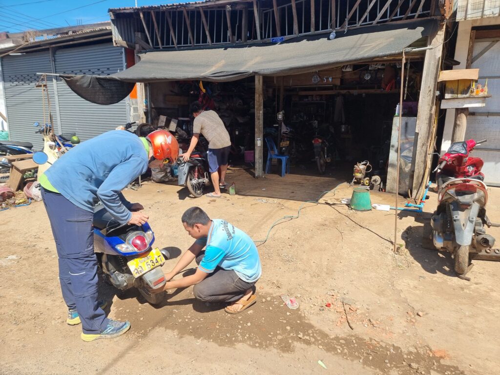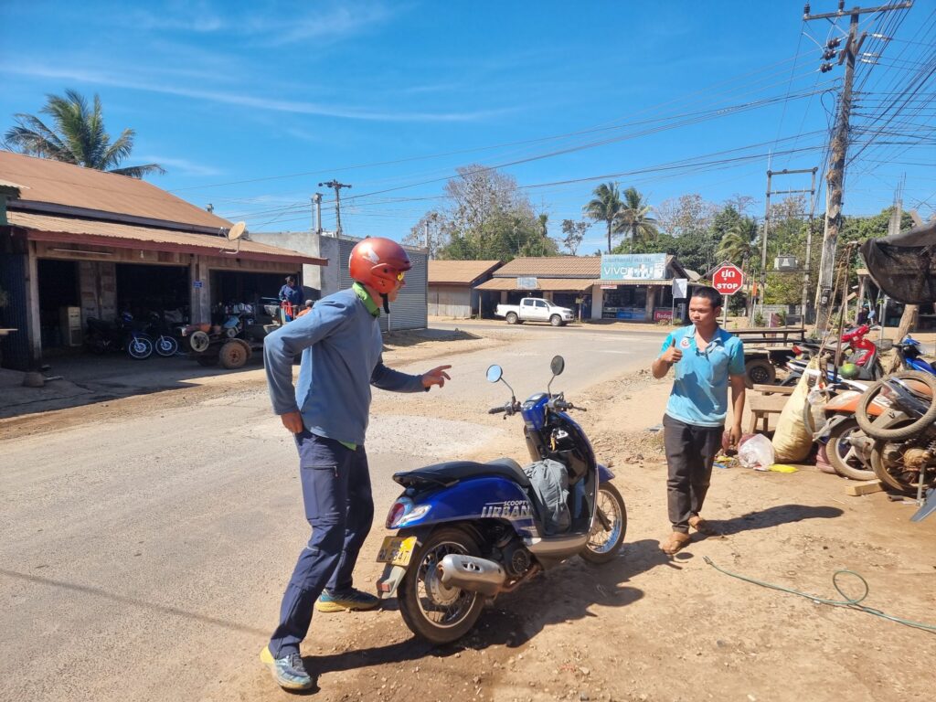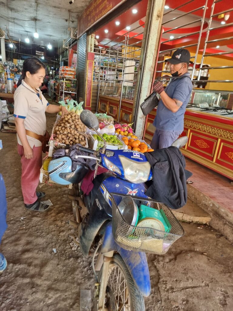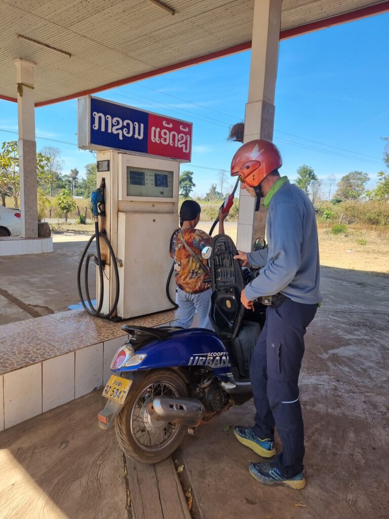 Das Moped bekommt Luft und Benzin und wir wollen uns auch stärken, ist aber auf dem lokalen Markt nicht so einfach.