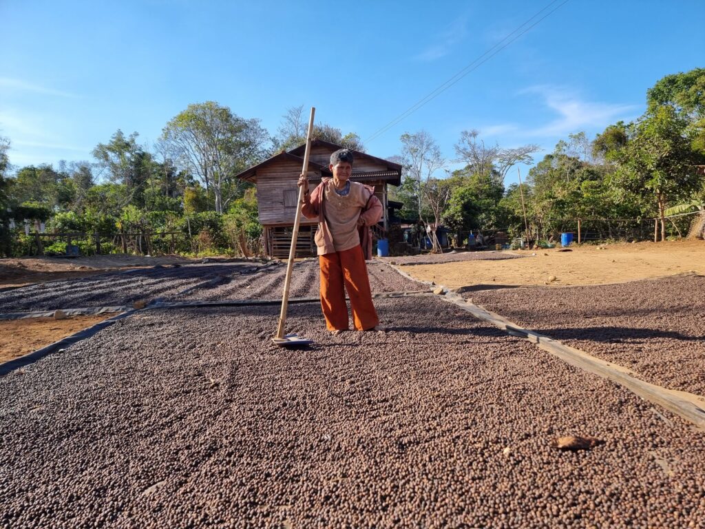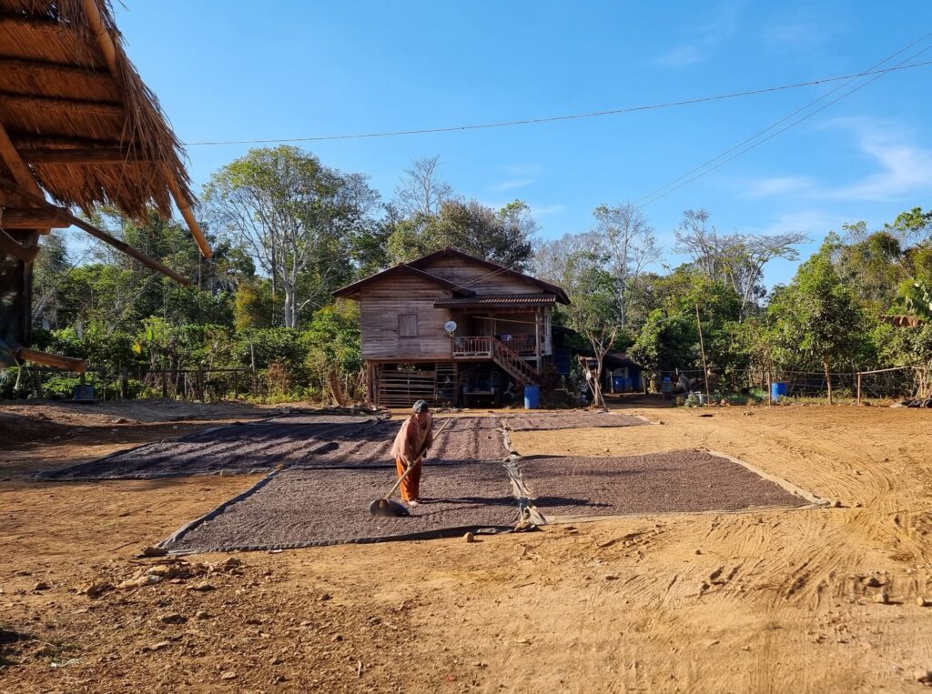 Wir kommen nochmal an einer Kaffeplantage vorbei, wo auch gerade der typische Lao Grüntee getrocknet wird- ich finde ja, der schmeckt immer bisschen nach alter Socke.