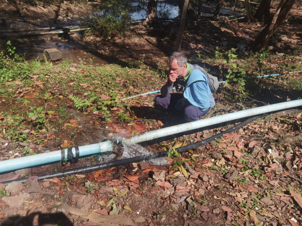 Nach einigen Kilometern landen wir am ersten Wasserfall zwischen Kaffeesträuchern, der gerade im schönsten Abendlicht glitzert.