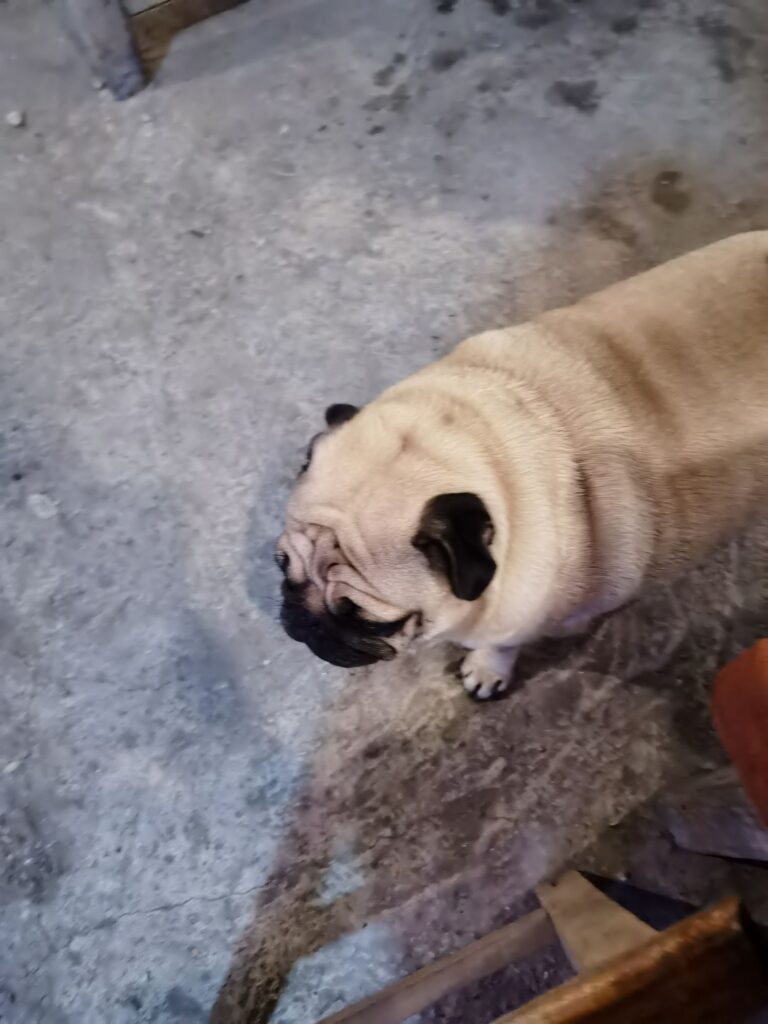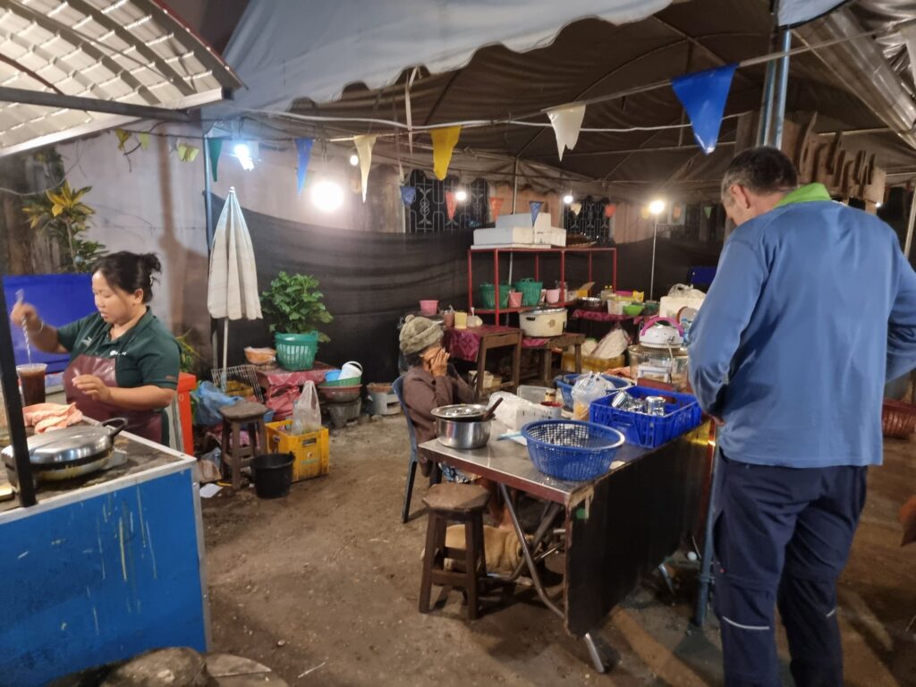 Wir drehen noch eine Runde im Ort und schauen uns 3 Unterkünfte an- die letzte ist ein alter französischer Kolonialbau und mit 200000Kip (9€) zum Preis eines Dormitories! Wir verlieben uns sofort und suchen in der Kälte (warum nur? Wir wollten doch in die Wärme..) ein nettes Restaurant, betrieben von 6 alten Frauen und einem dicken Hund.