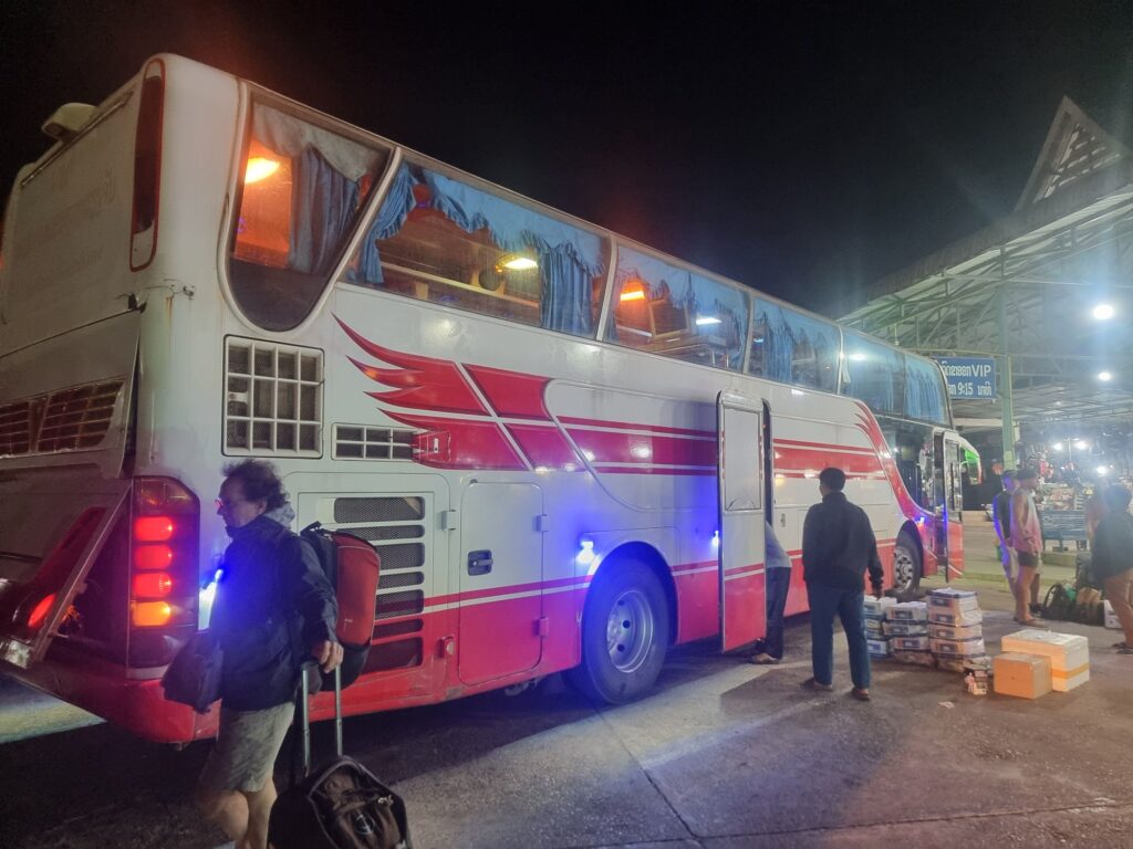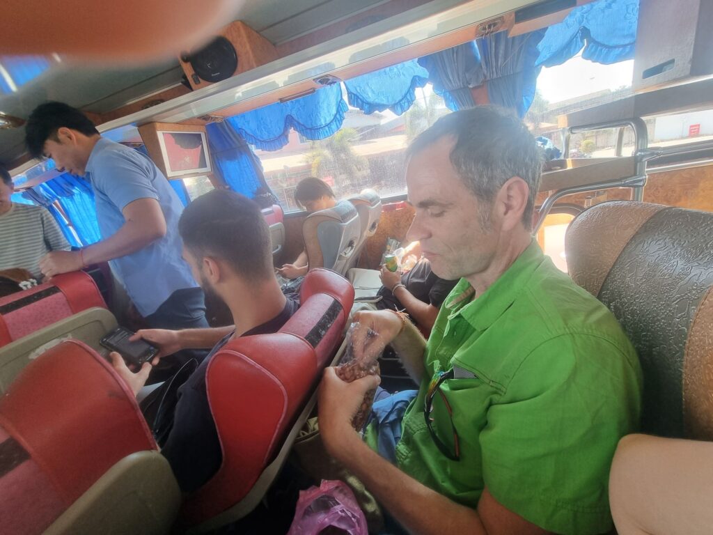 Anders als die normalen, früh startenden Busse hat dieser hier Sitze zum flätzen und ich bekomme nur einen ab, dessen Vorderplatz nicht mehr aufzurichten war- sehr kuschelig.