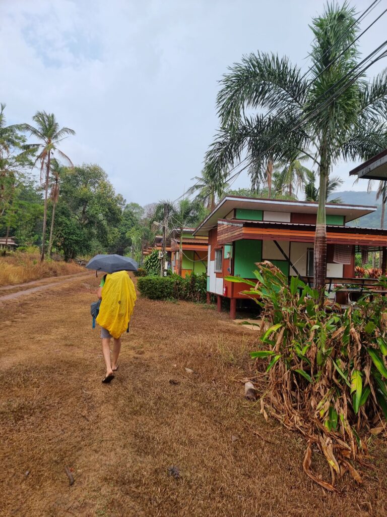 …soll nach Südthailand gehen, eine spektakuläre Gegend. Das heißt Abschied von unserem russischen Bungalow, passend im Regen.