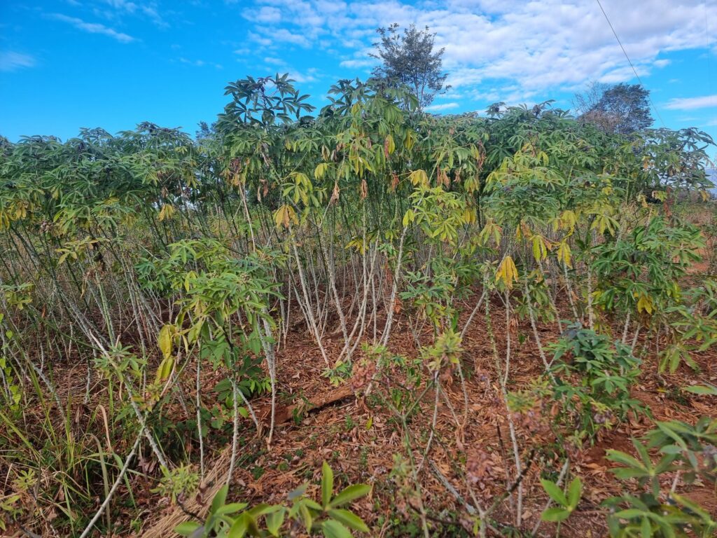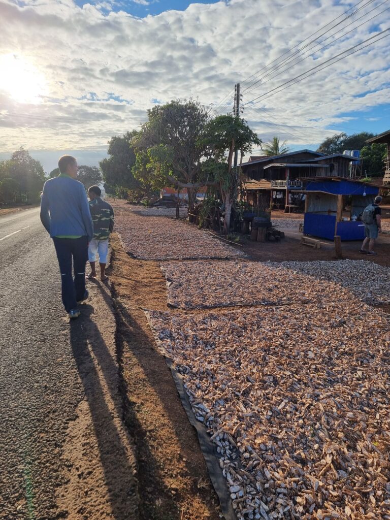 Unterwegs fahren wir immer wieder durch die Maniokernte. Der Baum wird ausgerissen, die Wurzeln geschreddert, ausgebreitet und getrocknet- ist dann wertvoller! Die Stämme werden hochkant gelagert, kurz vor der Regenzeit in Stäbe gebrochen und schlicht in die Erde gesteckt. Die Hälfte der Stangen überlebt diese Lagerung und schon kann es weiter gehen!