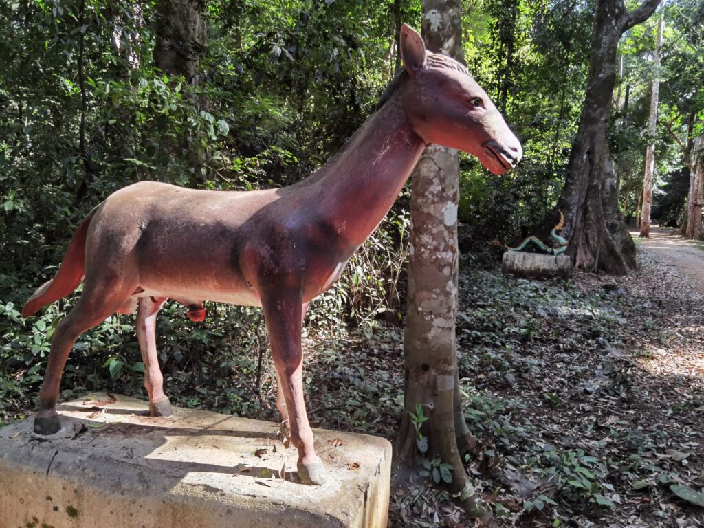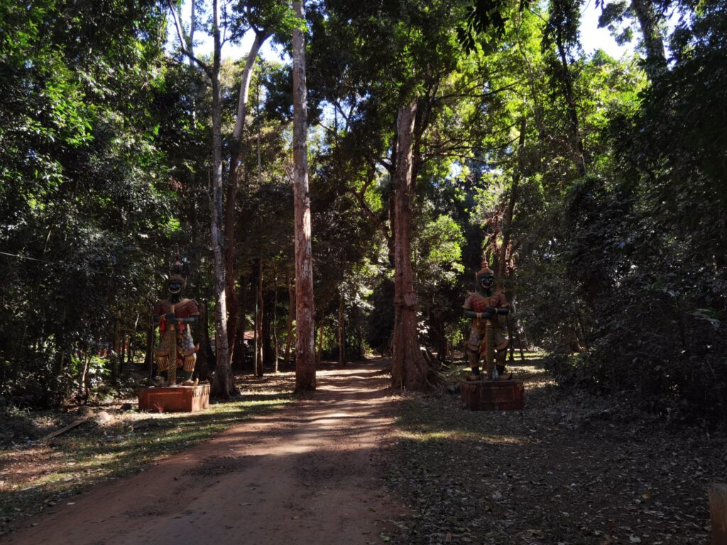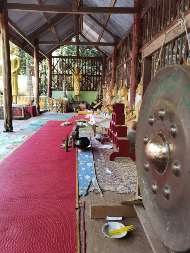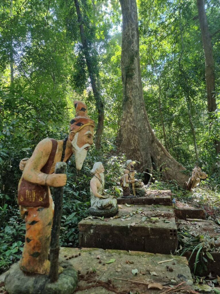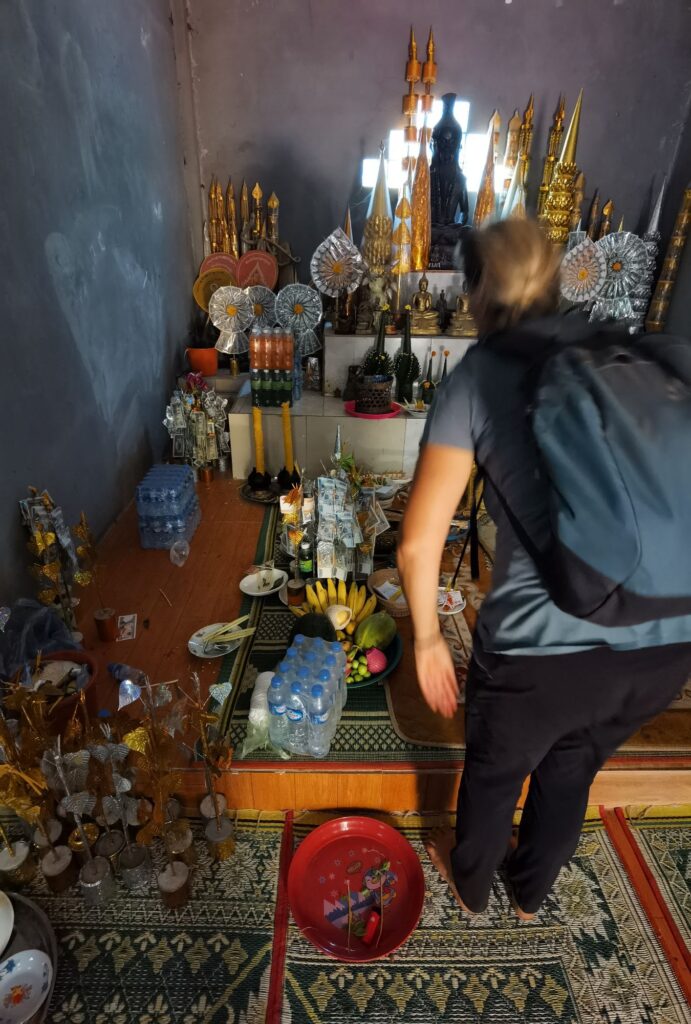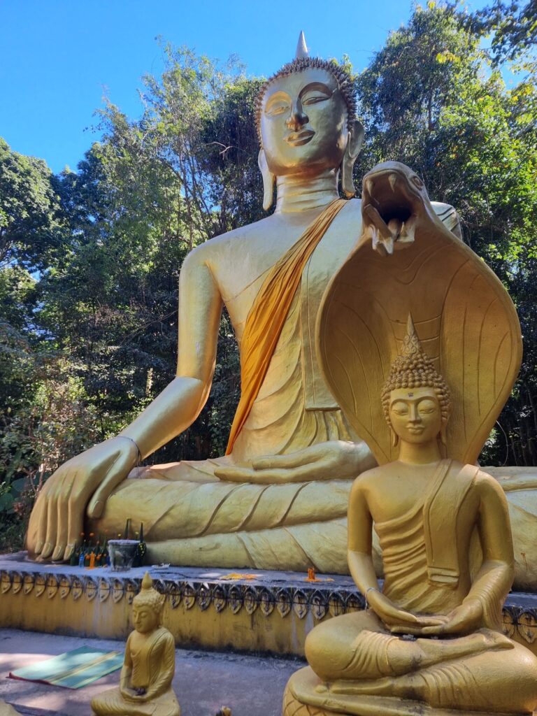Schon fast Mittag kommen wir los und suchen einen 1000 Jahre alten Baum, dem ein Buddhashrein gewidmet ist. Eine Höhle gibt es auch noch, aber wir haben kein Feuerzeug dabei, um die Luft dort unten zu testen- soll manchmal gefährlich sein. Die OSM Karten hier sind nicht gut gepflegt und so schickt uns das Navi über LPG Wege von hinten zum Wald- das ist schon Offroad!