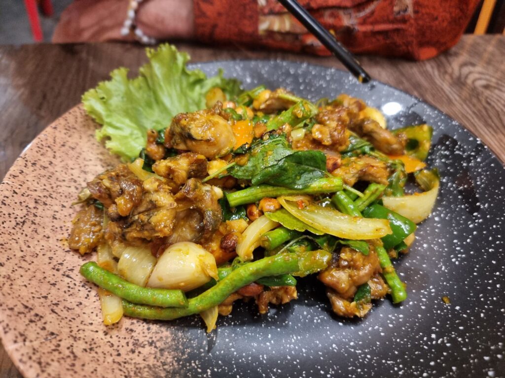 Experimentell versuche ich bei anderer Gelegenheit auch Frösche, die hier überall gezüchtet werden. Kann man kaum auf dem Teller erkennen, da hier nicht nur die Schenkel wie in Frankreich verwendet werden, sondern das ganze Tier grob zerhackt wird..