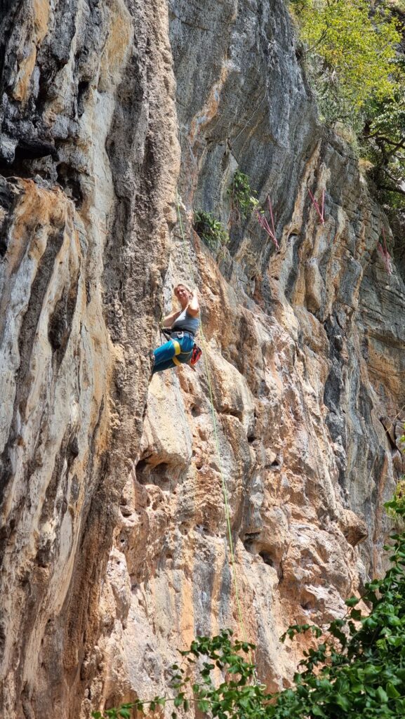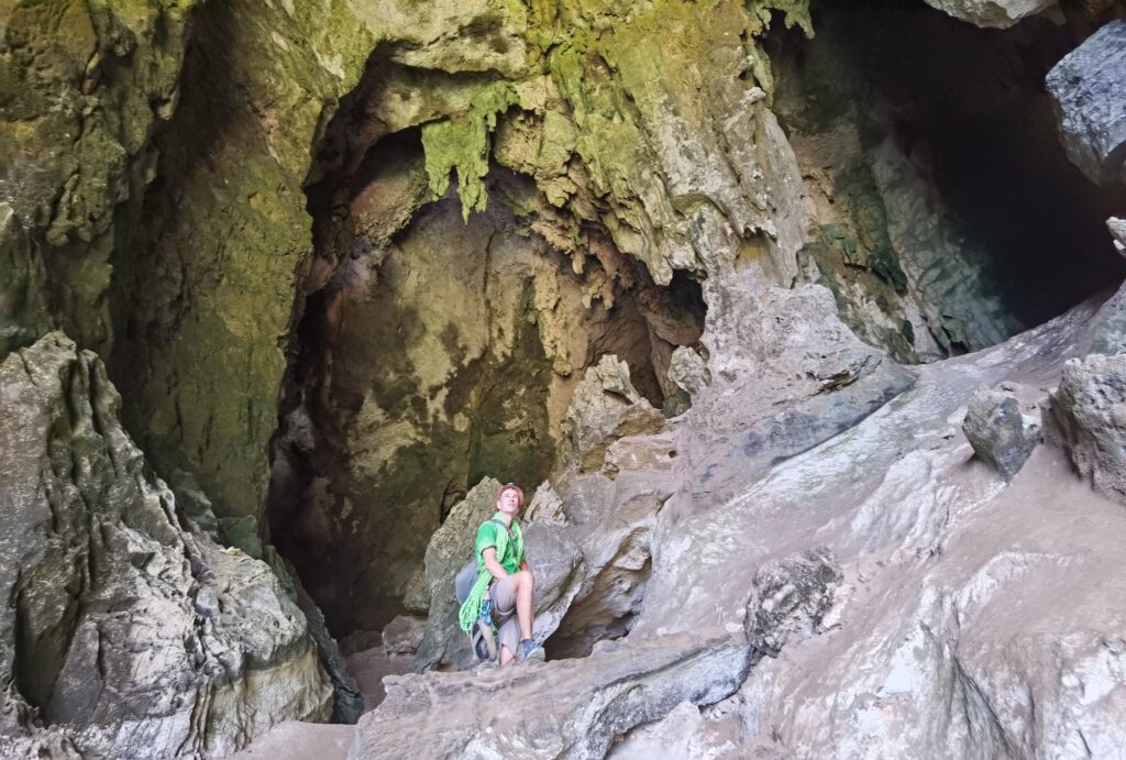 In 10 Minuten sind wir durch die Fledermaushöhle durchgekrabbelt und kommen zum Abseilpunkt. Irgendwie haben wir einen rutschigen Tuber geliehen bekommen, der dann unten landet…Ich seile mit dem anderen ab und schicke ihn hoch zu Mirko.