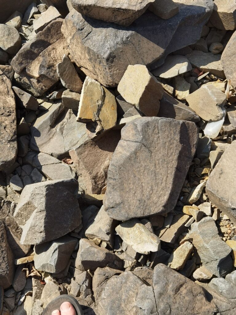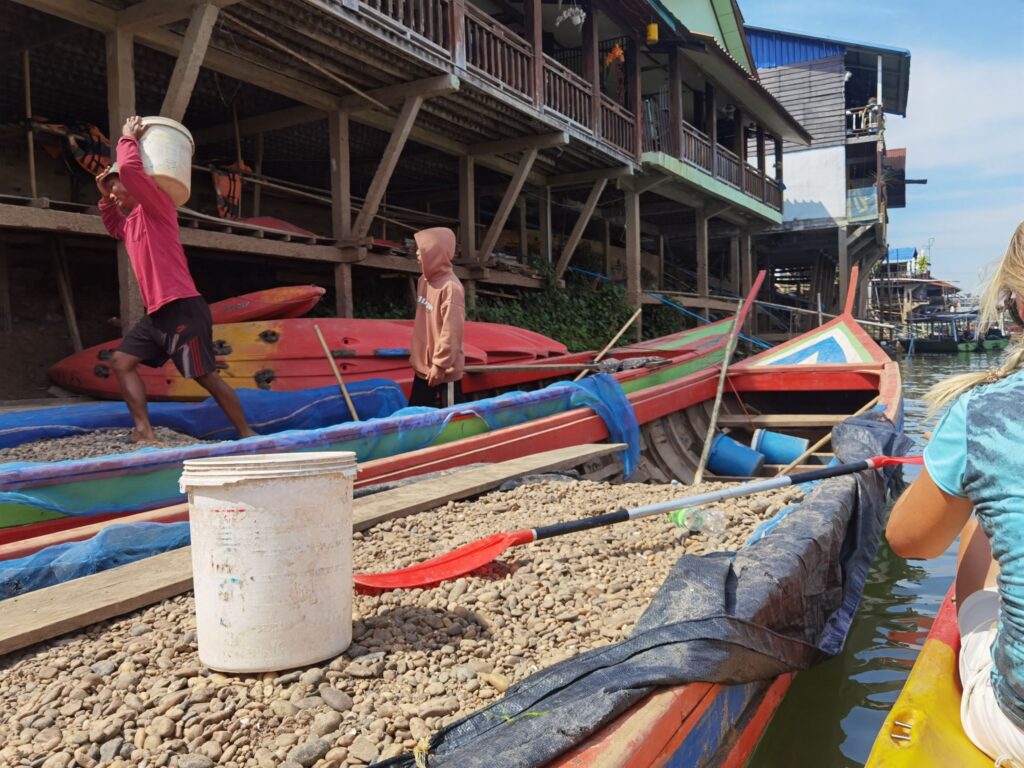 Das Kayak muss noch über 2 Lastkähne gebracht werden, voll mit Kies, welche gerade mittels Gurkeneimern auf der Schulter entladen werden- was für eine Rackerei!
