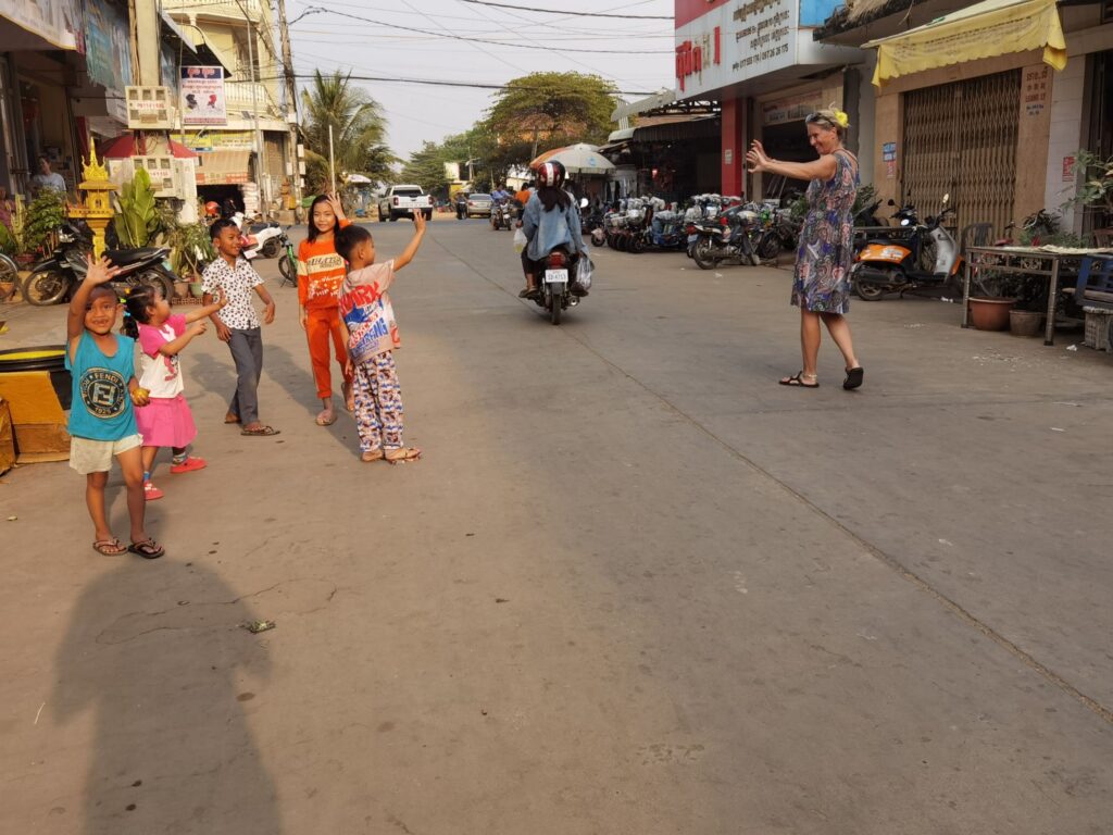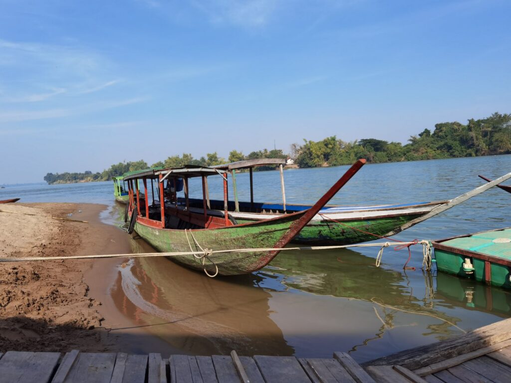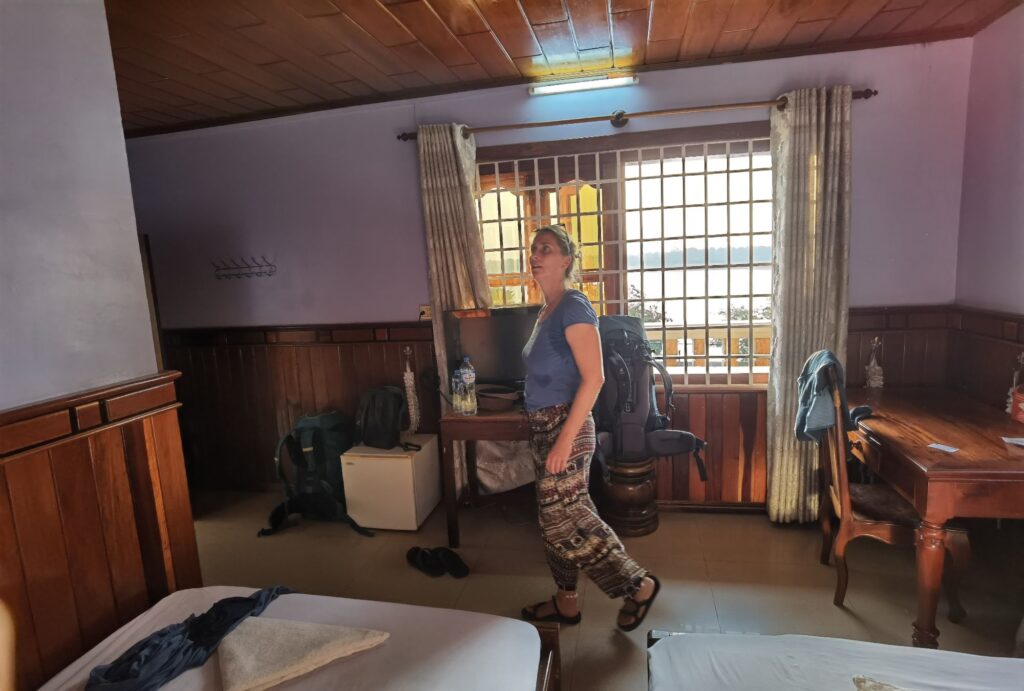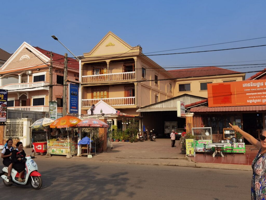 Angekommen in Kratie stellen wir fest, dass alle empfohlenen Unterkünfte schon belegt sind. Wir landen in einem alten Kolonialbau direkt am Fluss. Aura eher so mittel, mit Baustelle im Haus (wohl schon jahrelang) und Gittern vorm Fenster (wohl auch Standard hier) aber super Sonnenuntergang! Zuvor klärt uns der Besitzer darüber auf, dass man in Kambodscha nicht nochmal zurückkehren kann, wenn man zwischendurch noch andere Unterkünfte gecheckt hat, nach dem Motto “hab nix besseres gefunden”. Da haben wir aber gestaunt! Er hat uns aber dennoch rein gelassen..;-)