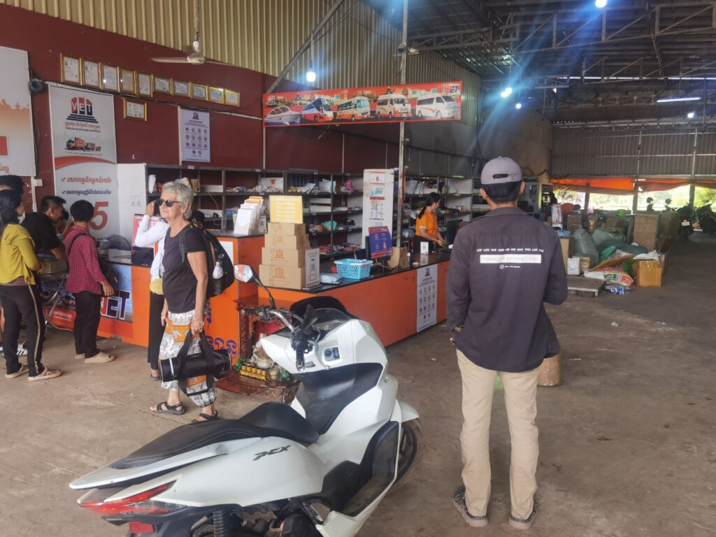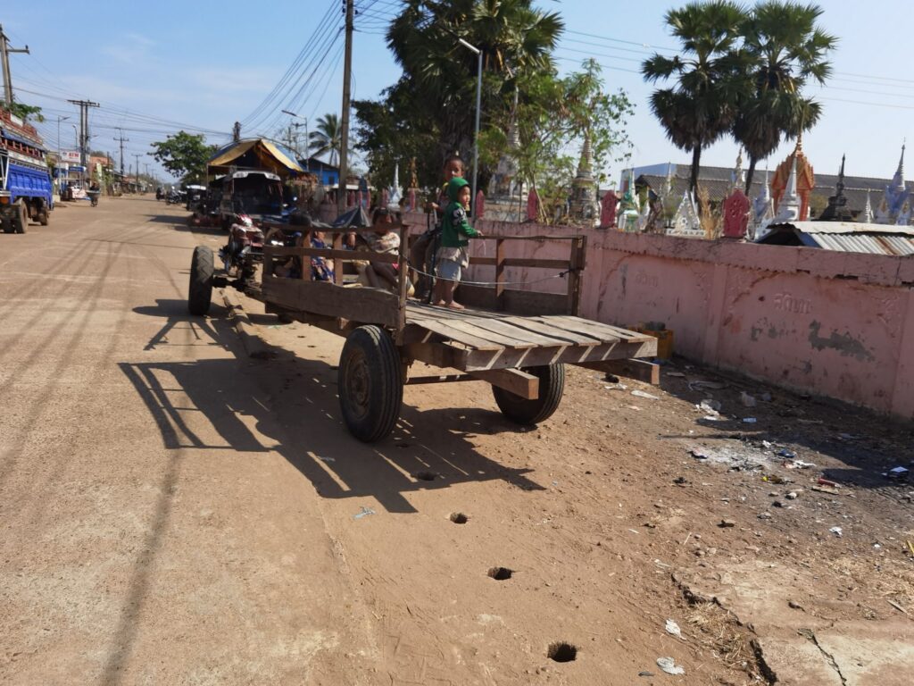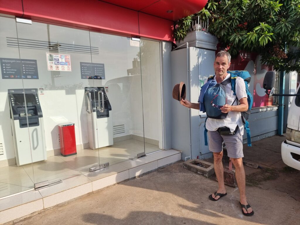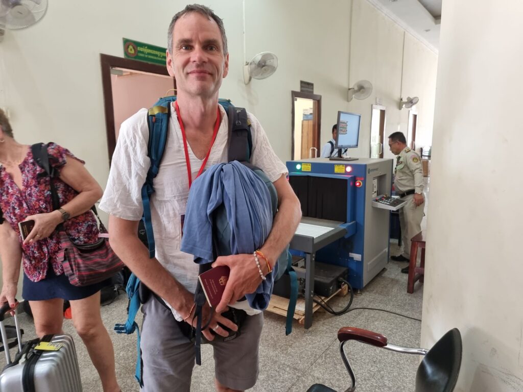 An der Grenze müssen wir samt Gepäck raus, zur Kontrolle, das Gepäck durch den Scanner. Auf wiedersehen, liebe Macheten, was mache ich denn in Kambodscha ohne euch, wenn mal wieder Verhandlungen anstehen? Mit trauriger Miene schiebe ich den Rucksack aufs Rollband und stelle dem Kontrolletti einige Fragen, damit er nicht immer auf den Bildschirm schaut. Das Gerät, laut Aufschrift ein Geschenk aus Japan, macht zwar bunte Bilder aber keinen Alarm…ich bekomme den Rucksack einfach so zurück!