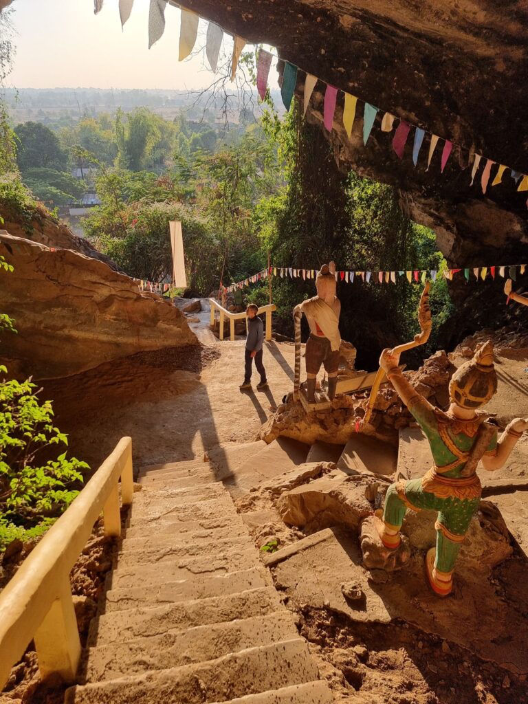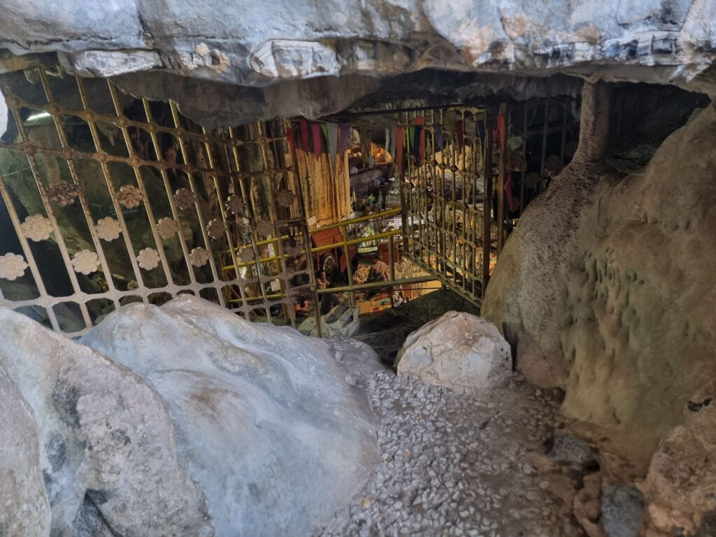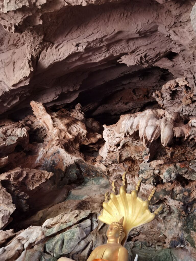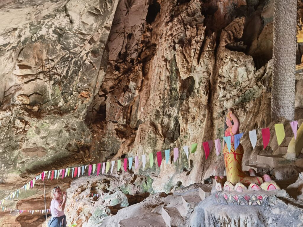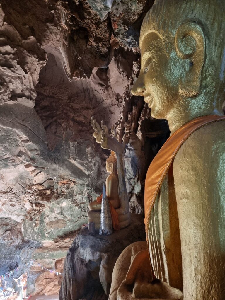 Da wir es schon auf die Schotterpiste geschafft haben, bleiben wir drauf und fahren weiter zur Buddhahöhle. Vor erst 20 Jahren hat dort ein Jäger auf der Suche nach Fledermäusen 229 versteckte Buddhafiguren aus Bronze und Gold gefunden, Jahrhunderte alt! (fotografieren leider verboten) Auf Grund einer Reisegruppe nahmen wir dort zuerst das Angebot war, uns mit einem Kahn eine Etage tiefer durch eine Wasserhöhle fahren zu lassen…