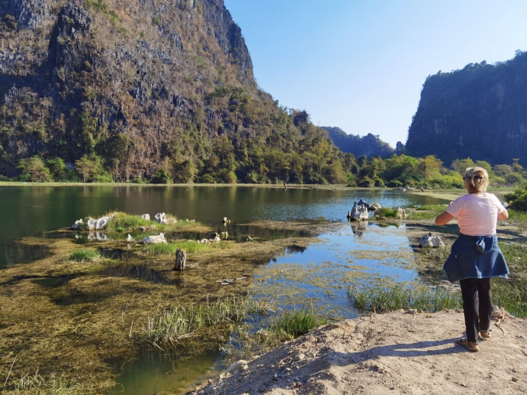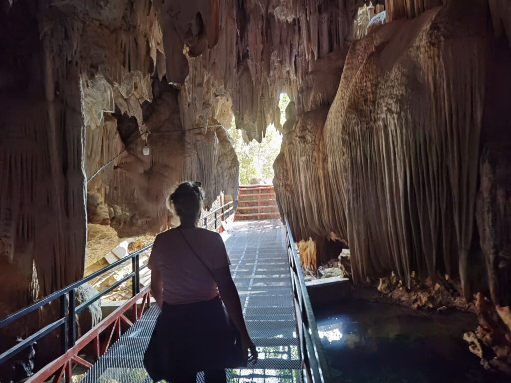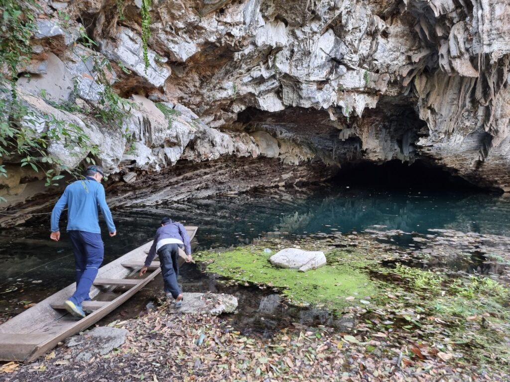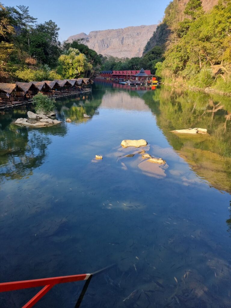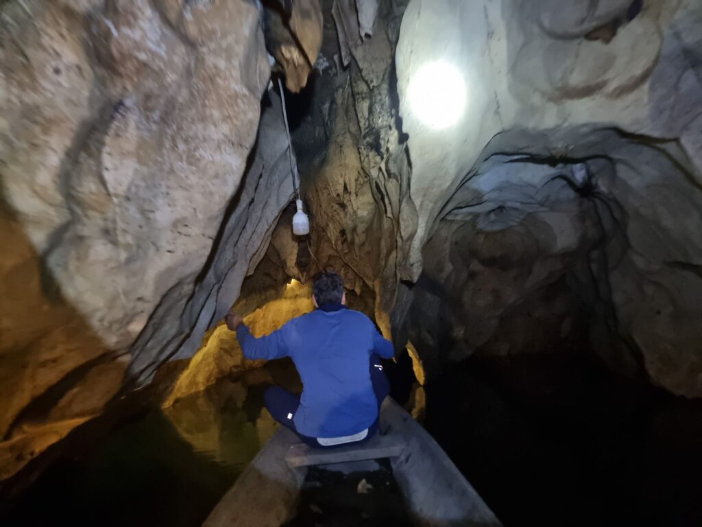 Da wir es schon auf die Schotterpiste geschafft haben, bleiben wir drauf und fahren weiter zur Buddhahöhle. Vor erst 20 Jahren hat dort ein Jäger auf der Suche nach Fledermäusen 229 versteckte Buddhafiguren aus Bronze und Gold gefunden, Jahrhunderte alt! (fotografieren leider verboten) Auf Grund einer Reisegruppe nahmen wir dort zuerst das Angebot war, uns mit einem Kahn eine Etage tiefer durch eine Wasserhöhle fahren zu lassen…