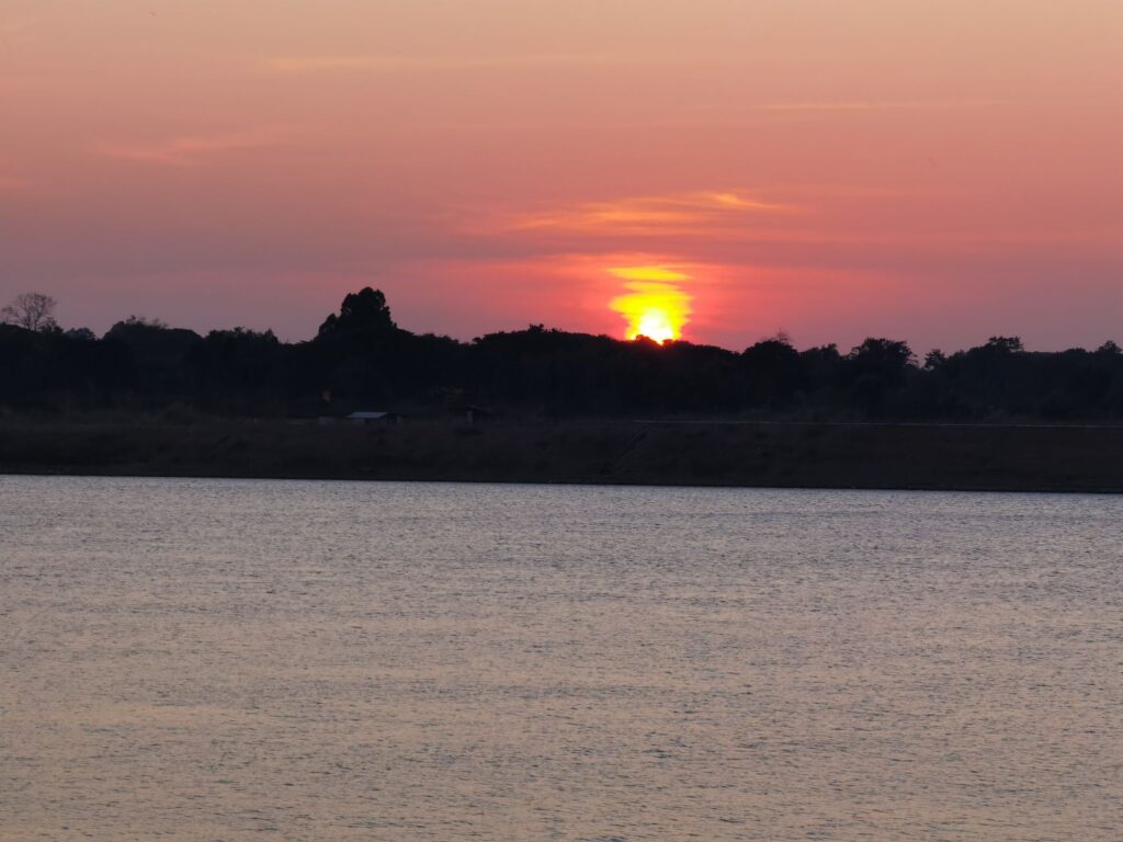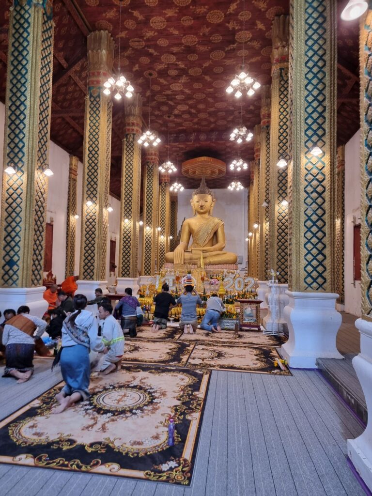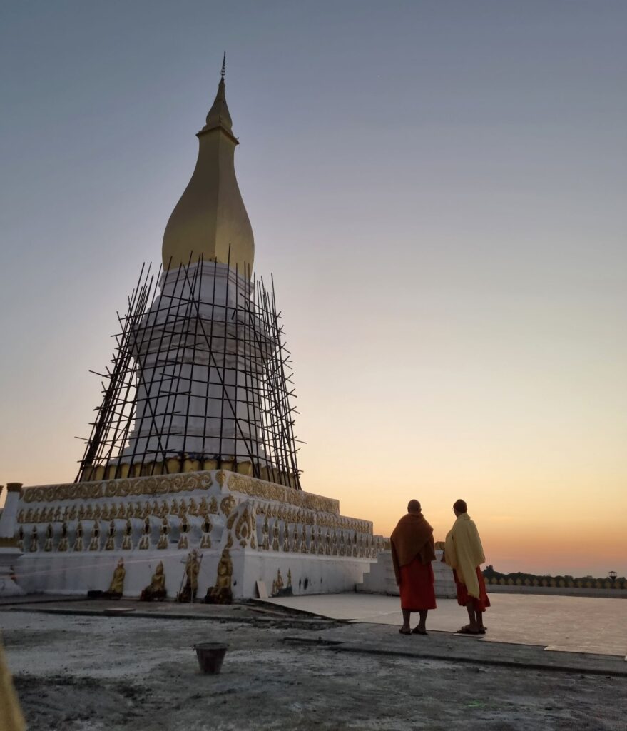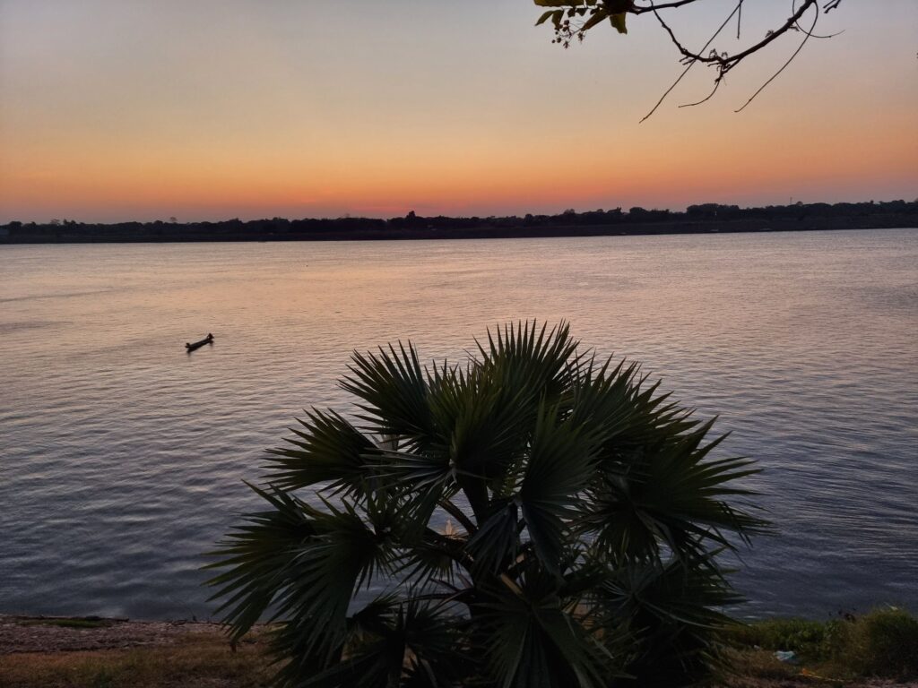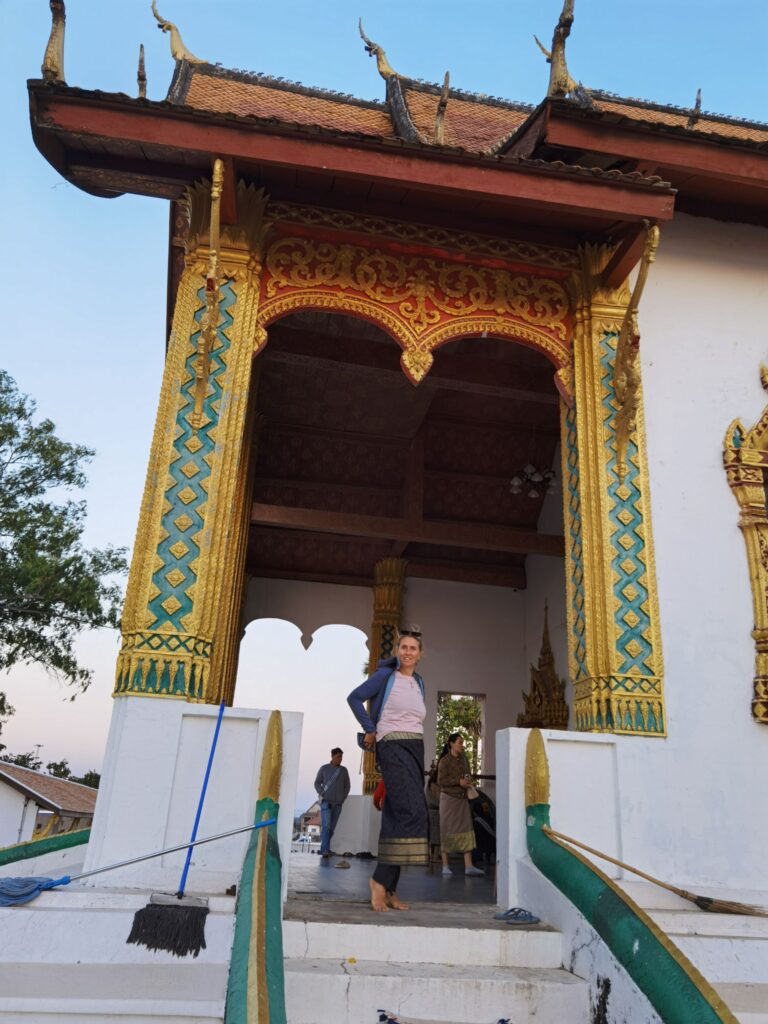 Den Sonnenuntergang wollen wir am Ufer des Mekong erleben, am Besten bei der goldenen Stupa und dem wichtigsten Tempel weit und breit- knapp schaffen wir es! Ein kleiner Junge ist von Angela über alle Maßen beeindruckt und kann sie nicht aus den aufgerissenen Augen lassen. Dabei bemerkt er aber leider nicht die Stufe in der Halle, purzelt hinunter und beißt sich die Lippe auf- der Arme!