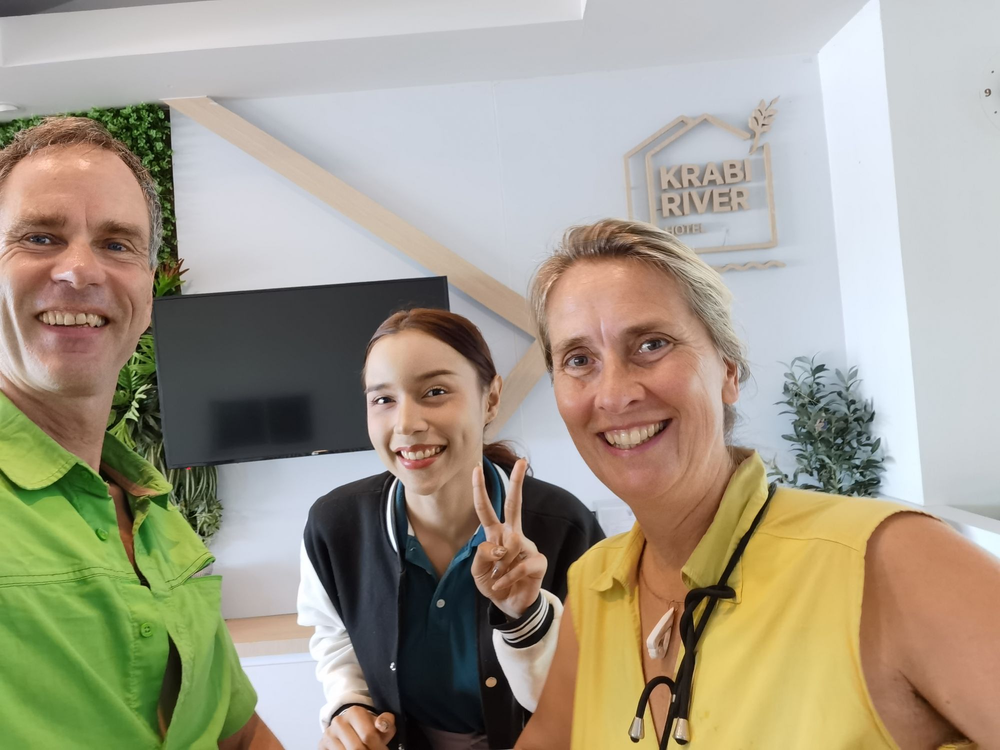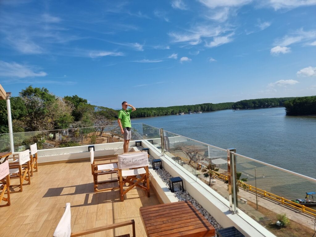 Die Nacht im Hotel war gut zum Schlafen, es gibt auch tagsüber kein Licht im Zimmer, aber wir sind ja auch gleich wieder weg. Erstmal gibt’s Frühstück in der Rooftop Bar nebenan, wo ein Süßer am Empfang sitzt.