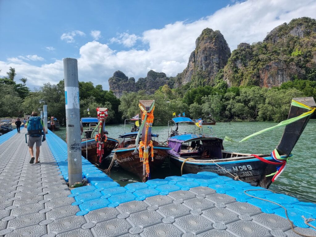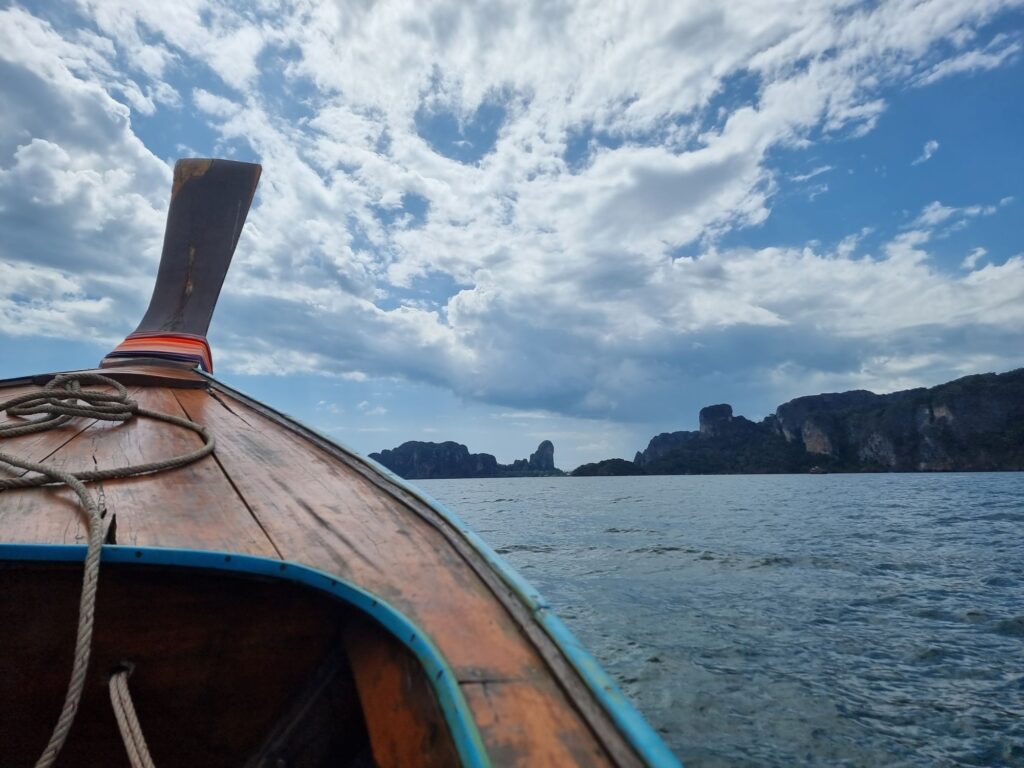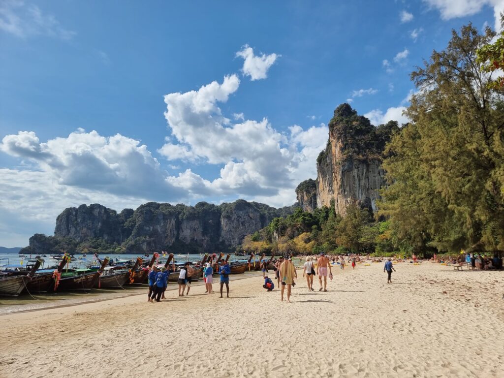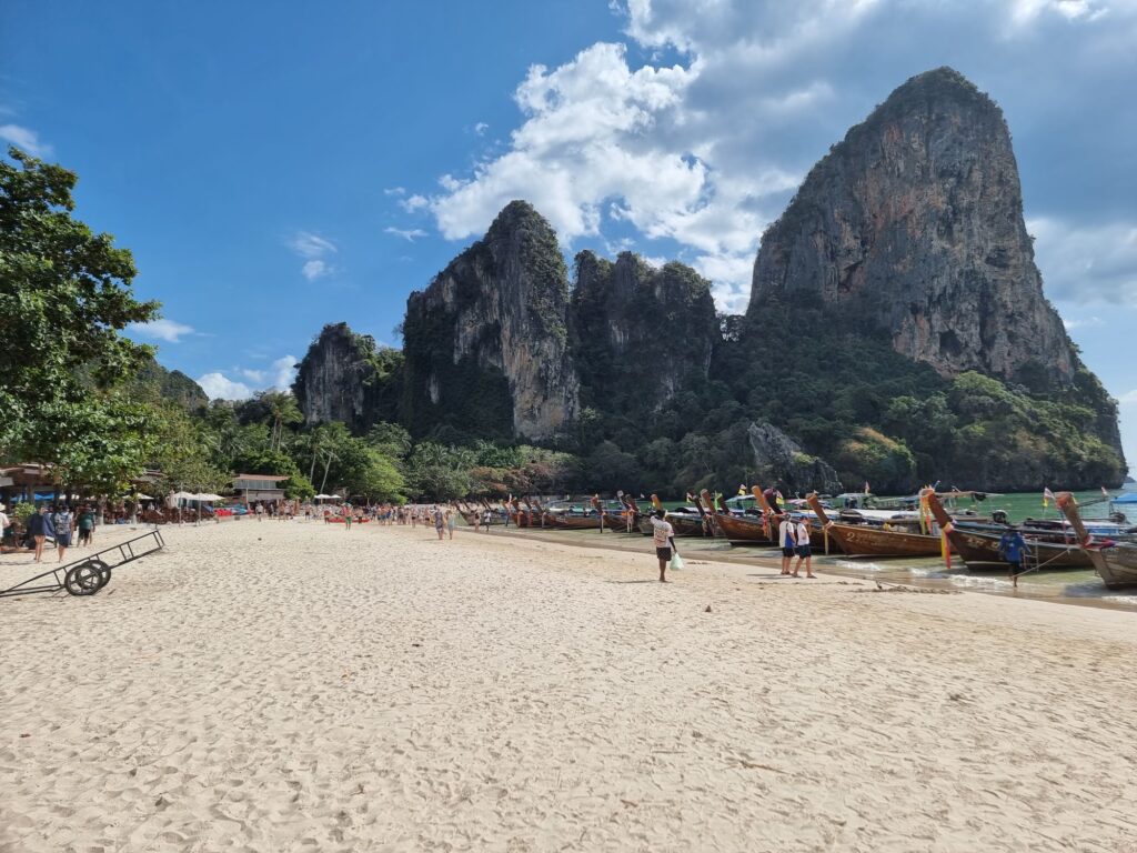 Mit einem größeren Longtailboot gehts jetzt nach Railay, dort gibt’s den Traum von Felsen, den Traum von Meer und von Strand, leider wissen das inzwischen viele Touristen.