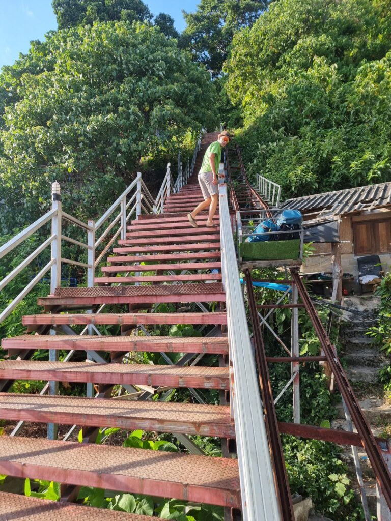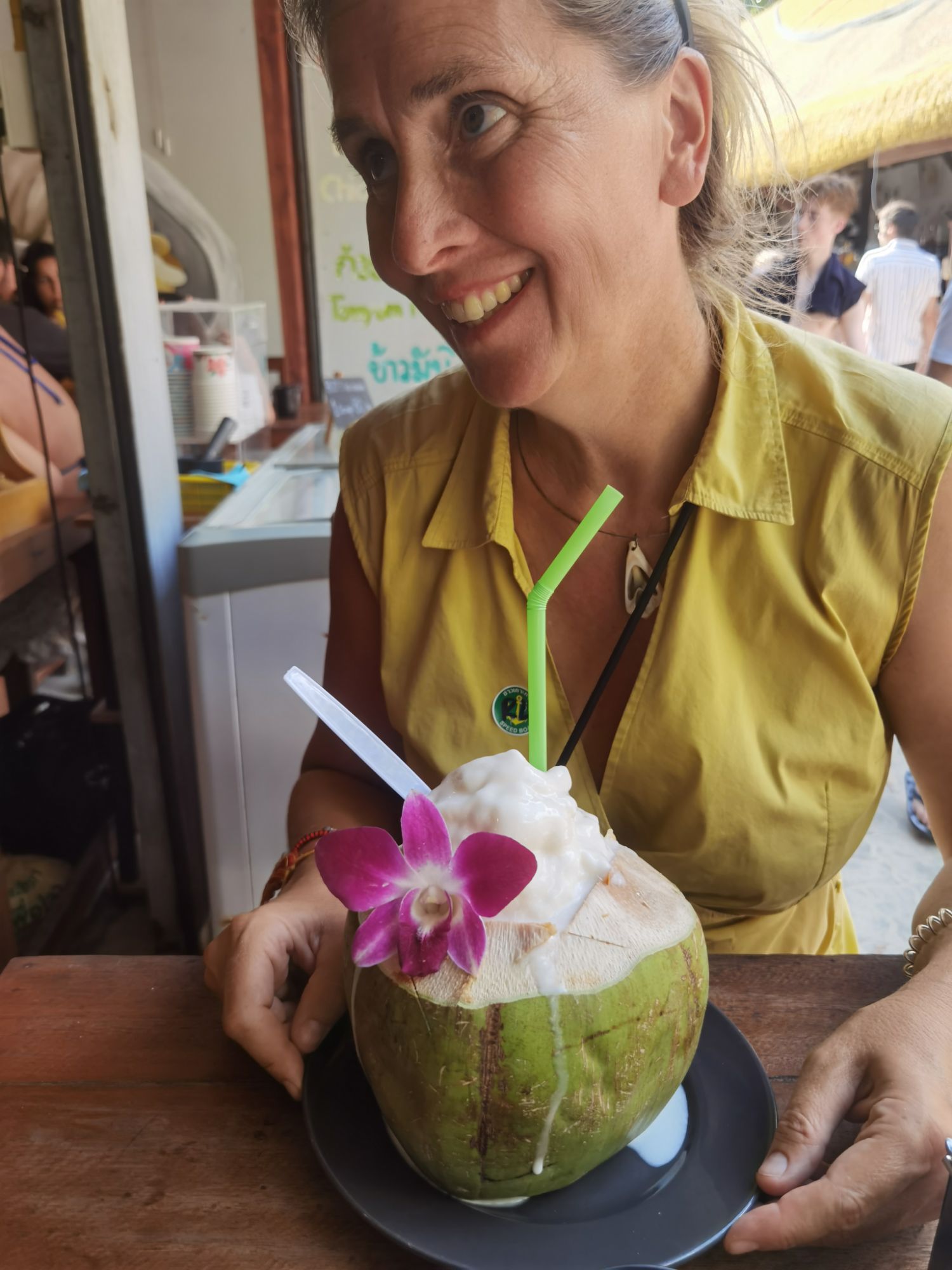 Als wir unser Zimmer beziehen wollen (haben tatsächlich vorgebucht!), stellt sich heraus, daß wir einen Tag zu früh sind. Konnte ja nichts werden mit solchen Vorplanungen! Da heute auch noch nichts frei ist, überlegen wir, am Strand zu schlafen, finden dann aber noch den letzten freien bezahlbaren Bungalow auch noch direkt daneben. Na dann also nochmal zum Strand zum Sonnenuntergang mit Kokosnuss Shake.