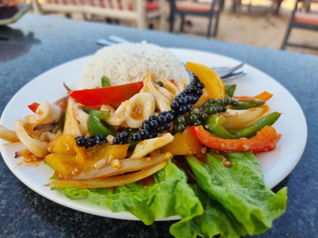 Gleich hinter unserem Bungalow gibt es eine kleine Korallenbank und wir beschießen, zur Abkühlung die mal zu untersuchen. Tatsächlich ist es zu Hause gar nicht mal schlecht und von überaus bunten Fischen bewohnt, mit Seegurken in weiß und schwarz sowie extrem langstachligen Seeigeln übersäht- super! Ich finde aber auch ein altes Stellnetz, in welchem sich ein großer Fisch mit der Kieme verfing und verendete. Meine Mission war geboren: ich sammelte das (zum Glück nicht allzu lange) Netz ein und brachte es an Land. Als ich endlich fertig war, suche ich erfolglos Angela in der Bucht. Ihre Sandalen liegen noch da, mir rutscht das Herz in die Hose! Doch, ganz vorn am Kap, das könnte sie sein. Nix wie hin und tatsächlich- ihr Herz war auch in der Hose und sie suchte mich dort! Alles gut gegangen, puh!