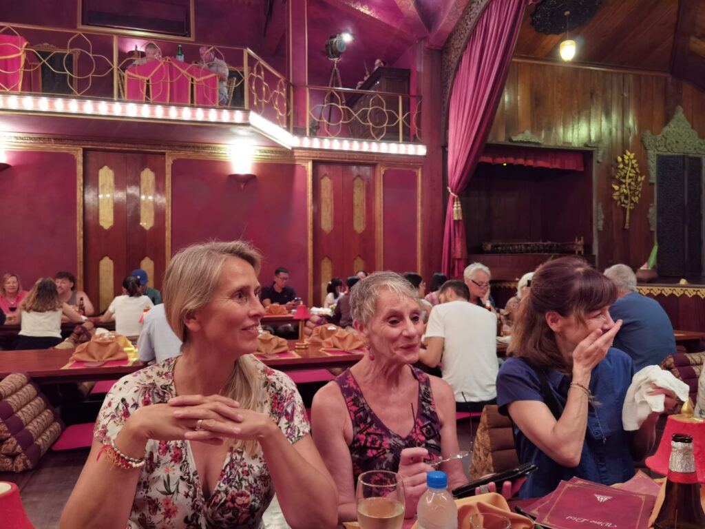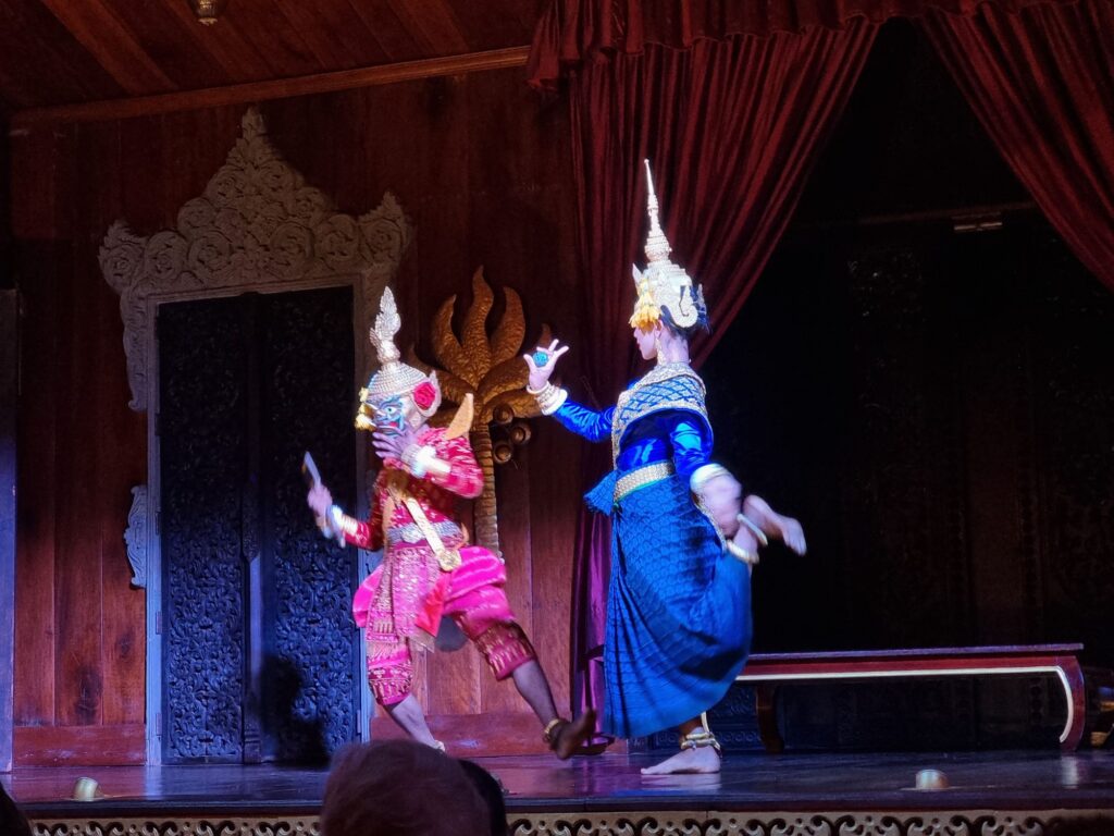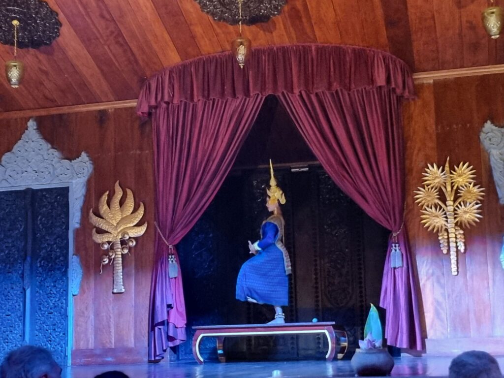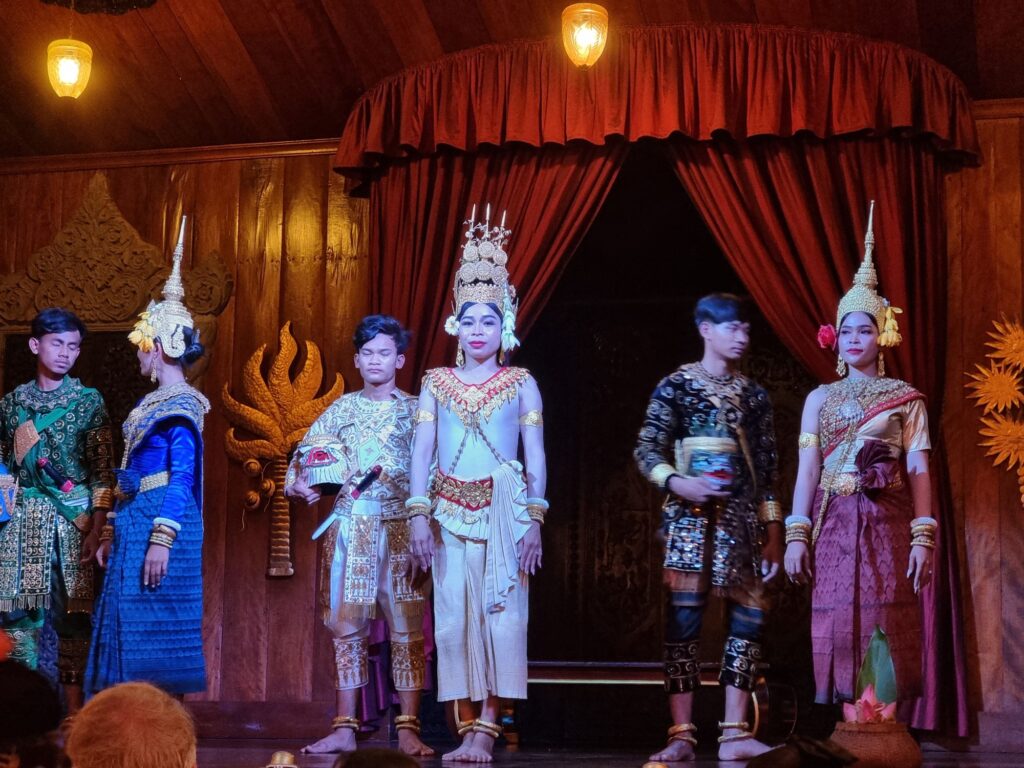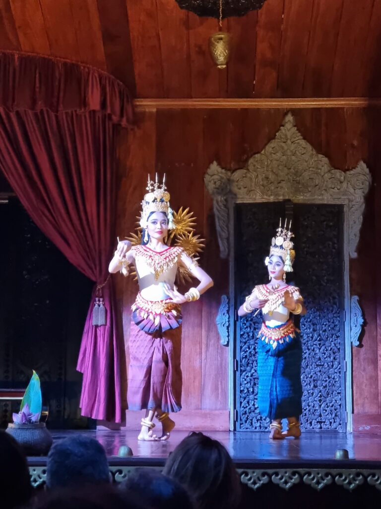 Siem Riep scheint der einzige Ort zu sein, wo noch traditionelle Tänze aufgeführt werden. Die will ich unbedingt sehen, und so ruft unsere Wirtin im Apsara Theater an, um uns Karten zu besorgen. Die gibt’s nur in Verbindung mit einem Dinner. So sitzen wir in internationaler Runde zwischen Koreanern, Belgiern, Engländern an traditionellen Tischen und genießen lecker Essen und beeindruckenden Tanz.