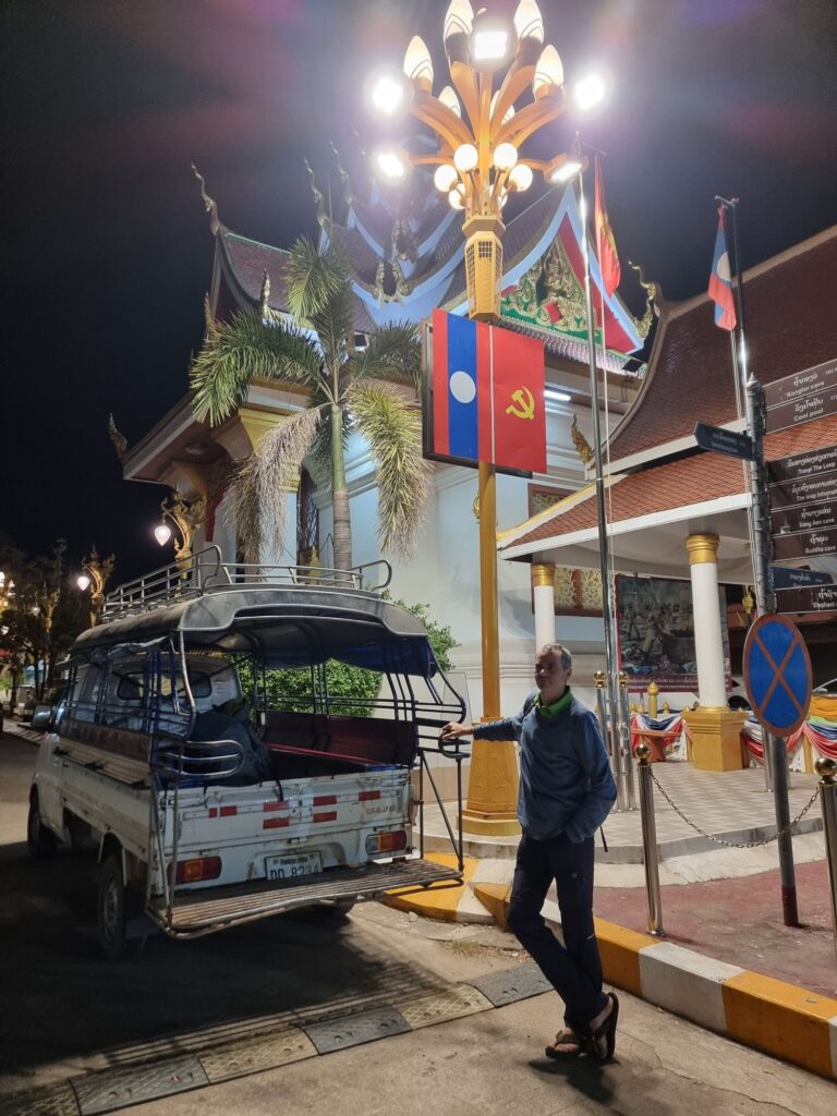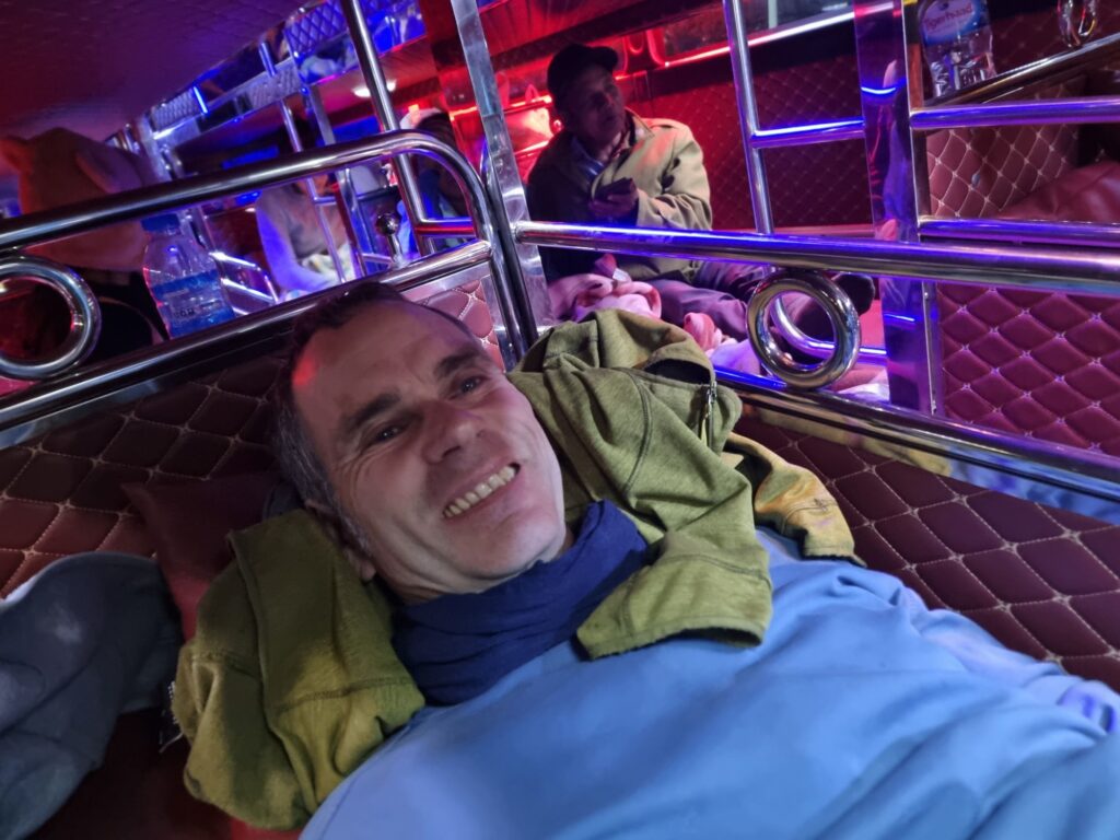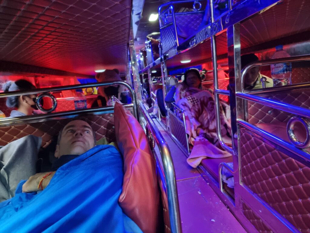 Das ist ein Erlebnis…in leider nur 1.60m langen Doppelstock- Doppelliegen begeben wir uns auf Reisen. Dabei haben wir Glück, dass wir zu zweit sind, als Einzelreisender kommt man einfach mit einem Mönch oder einer anderen fremden Person auf die Kuschelliege! Licht geht aus, Musik aber an und Rumpeln geht auch nicht weg auf den laotischen Straßen…Gute Nacht!