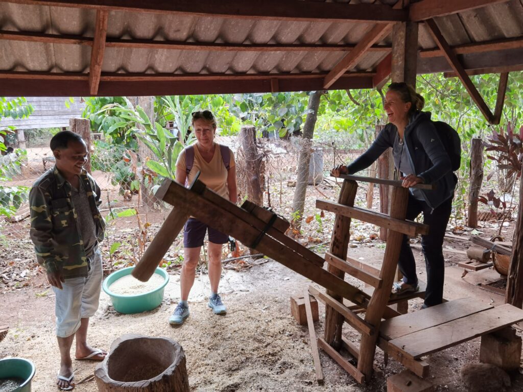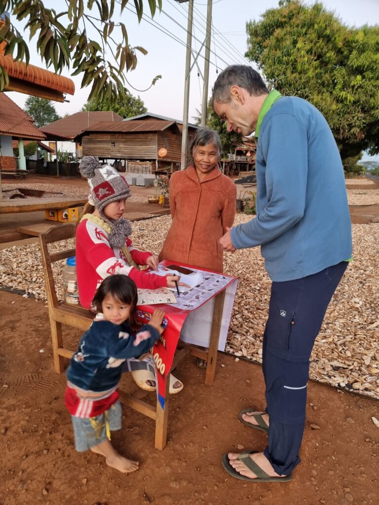 60 km auf Moped sollen reichen, Mr. Vieng betreibt neben einer Kaffeeplantage auch ein Homestay. Das nette Dorf der Khatu drumrum gibt uns Gelegenheit, letzte Geschenke an die Kinder loszuwerden und Lotto zu spielen.