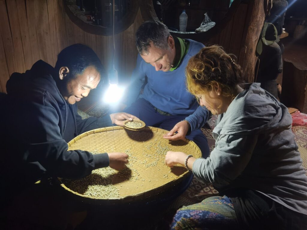 Nach dem Abendbrot helfen wir noch, schlechte Kaffeebohnen auszusortieren.